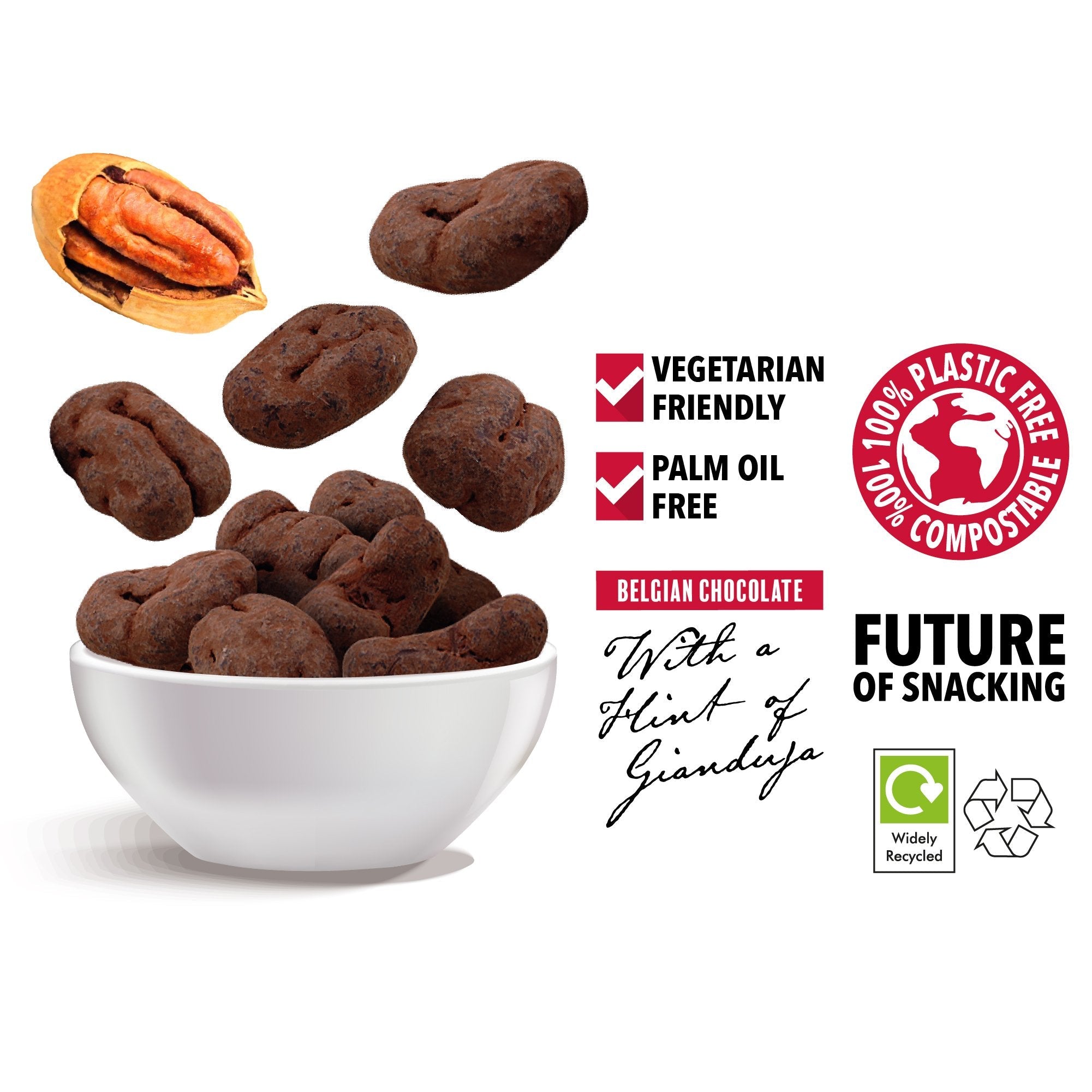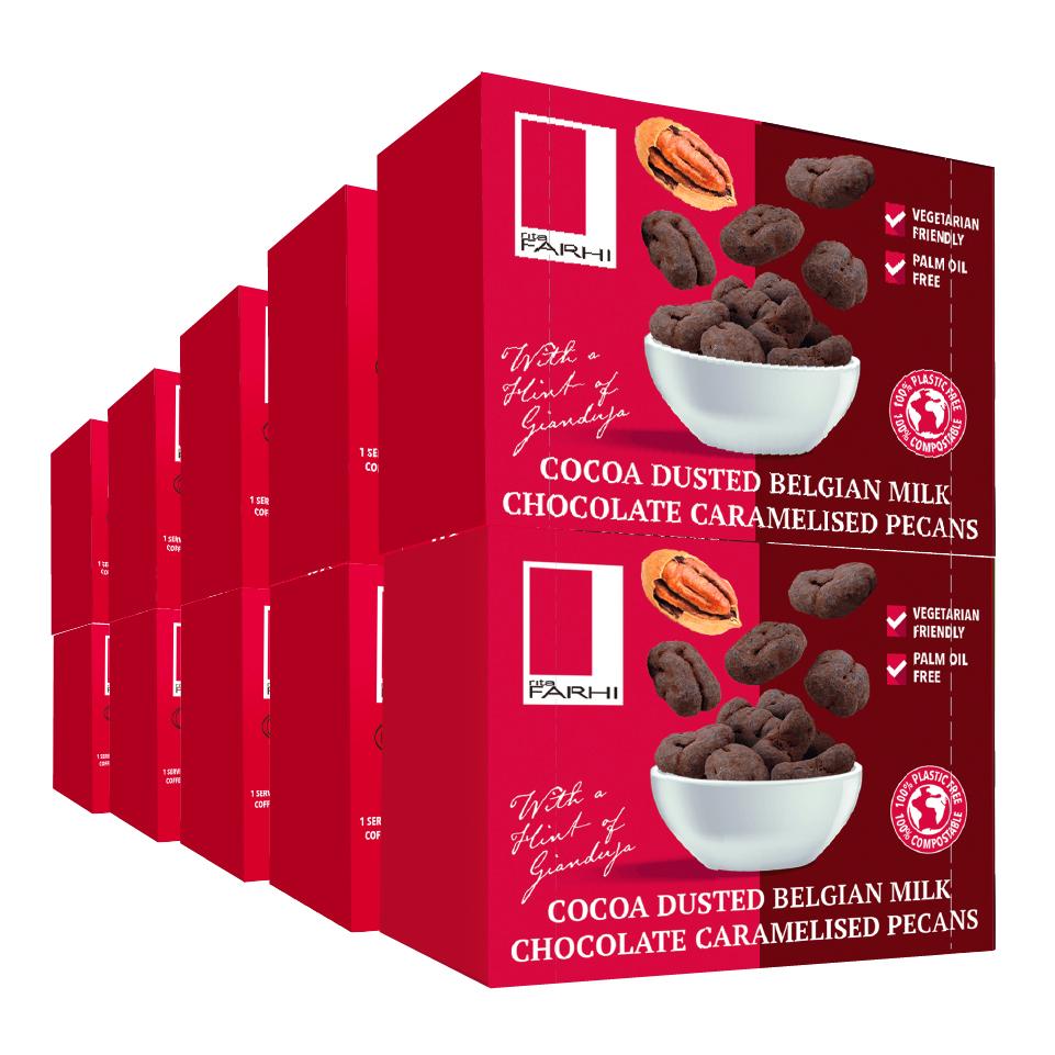 Our new snack boxes are filled with some of our most-loved treats. With two portions per container, you can truly take luxury snacks with you on the go. Delicious pecans coated with smooth Belgian milk chocolate and a hint of luxurious Gianduja, finished with a light dusting of cocoa for the most decadent of treats. Packed in our eco-friendly handy snack-box that is also plastic free and compostable. Snacking doesn’t get much better.