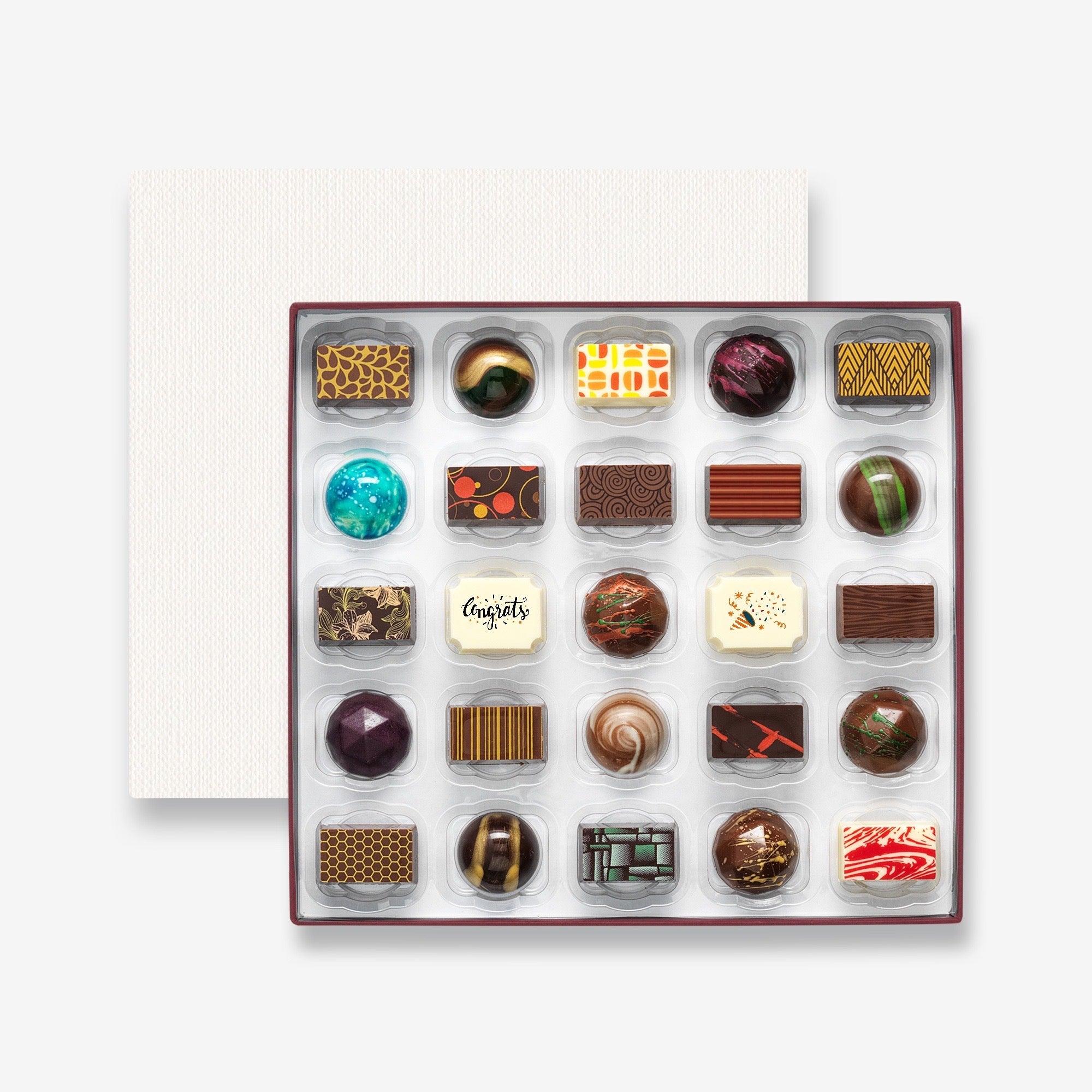 A luxury selection box of 25 filled artisan chocolates, featuring two special 'Congratulations' themed chocolates. Made with natural ingredients and hand-decorated with cocoa butter.
