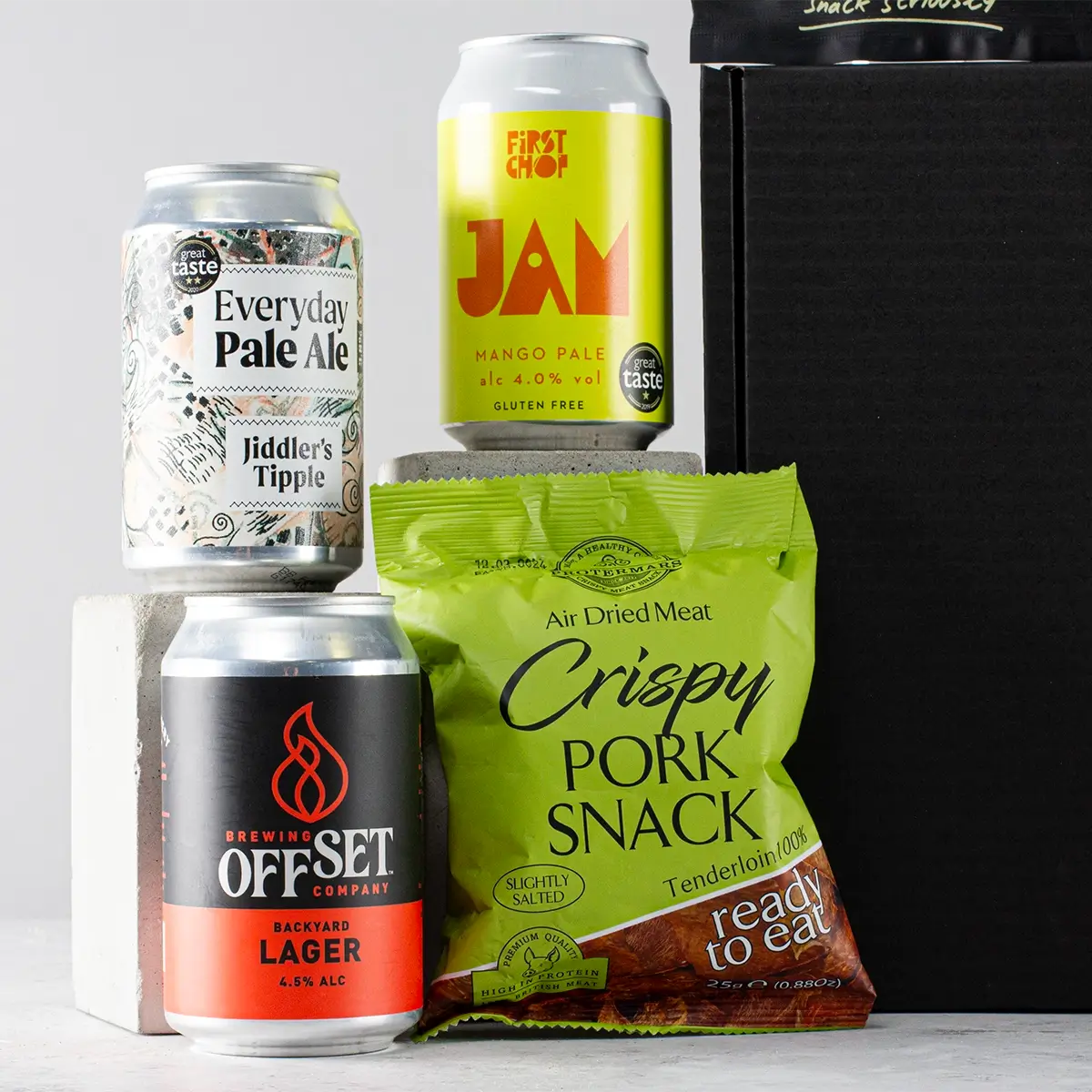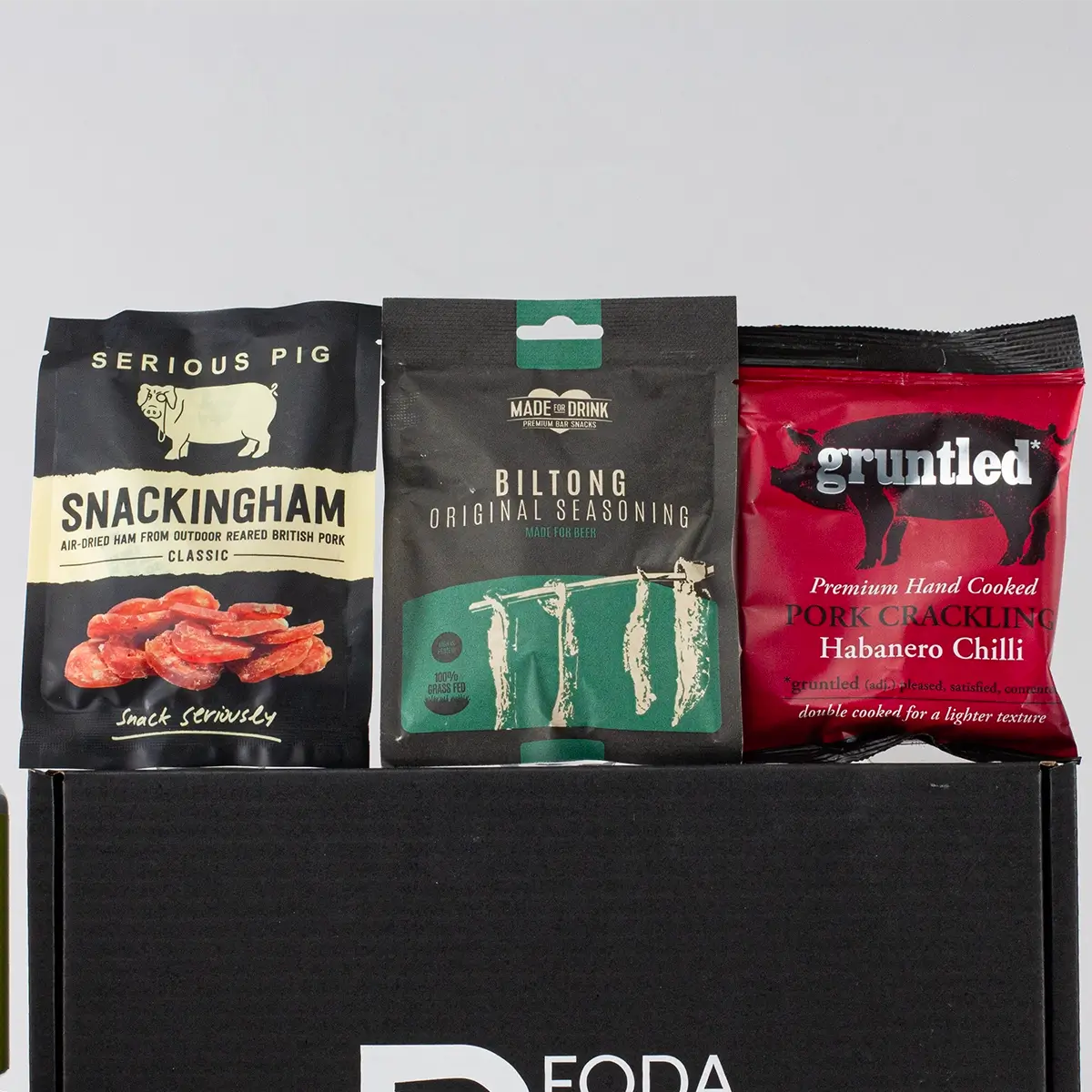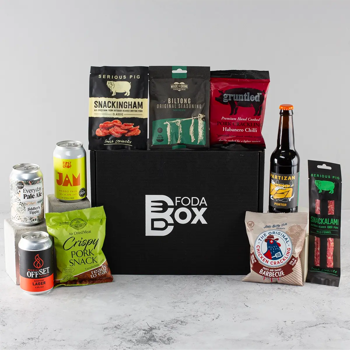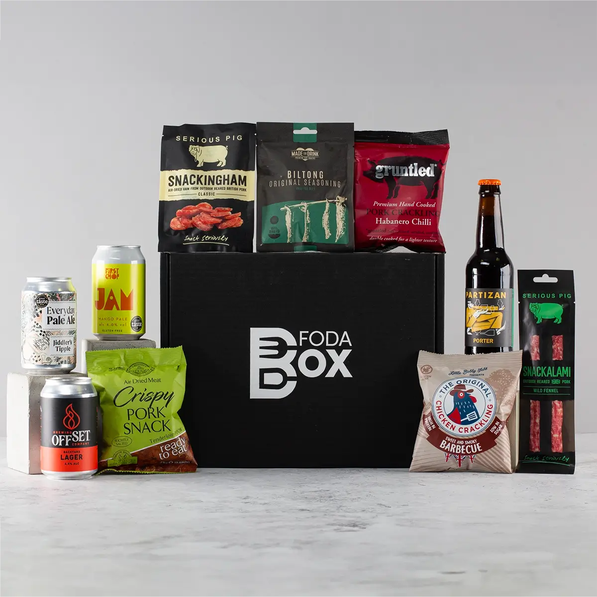 Experience the ultimate fusion of flavours and fun with our FodaBox Craft Beer and Meat Snacks Gift Box – an exquisitely curated indulgence that brings the essence of a traditional British pub straight to your door. This craft beer gift box has been skilfully designed for those who appreciate the finer things in life, combining a selection of four premium craft beers with a mouthwatering assortment of savoury meat snacks. Every sip and bite conveys a tale of passion, quality and indulgence, making it the perfect present for birthdays, Father’s Day, special celebrations or simply to enjoy a cosy evening at home. With robust brews such as the rich and velvety Partizan Porter alongside the refreshing and fruity First Chop Jam Mango Pale, this craft beer box gift offers a unique tasting experience that caters to diverse palates. Complementing the beers are delectable meat treats, including Gruntled’s Habanero Chilli pork crackling, Serious Pig’s Classic Snackingham, Wild Fenel Snackalami, Made for Drink’s Biltong, Protermars Chicken Snacks and Little Bobby Jebbs Chicken Crackling BBQ – each snack delivering both protein benefits and a satisfying crunch that pairs perfectly with every pint. Not only does this gift box set the scene for a virtual pub experience complete with laughter and camaraderie, it also encapsulates the art of modern gifting where quality meets convenience. Whether savoured in the company of friends or as a personal indulgence, every element in this set is a testament to premium craftsmanship and gourmet flair.