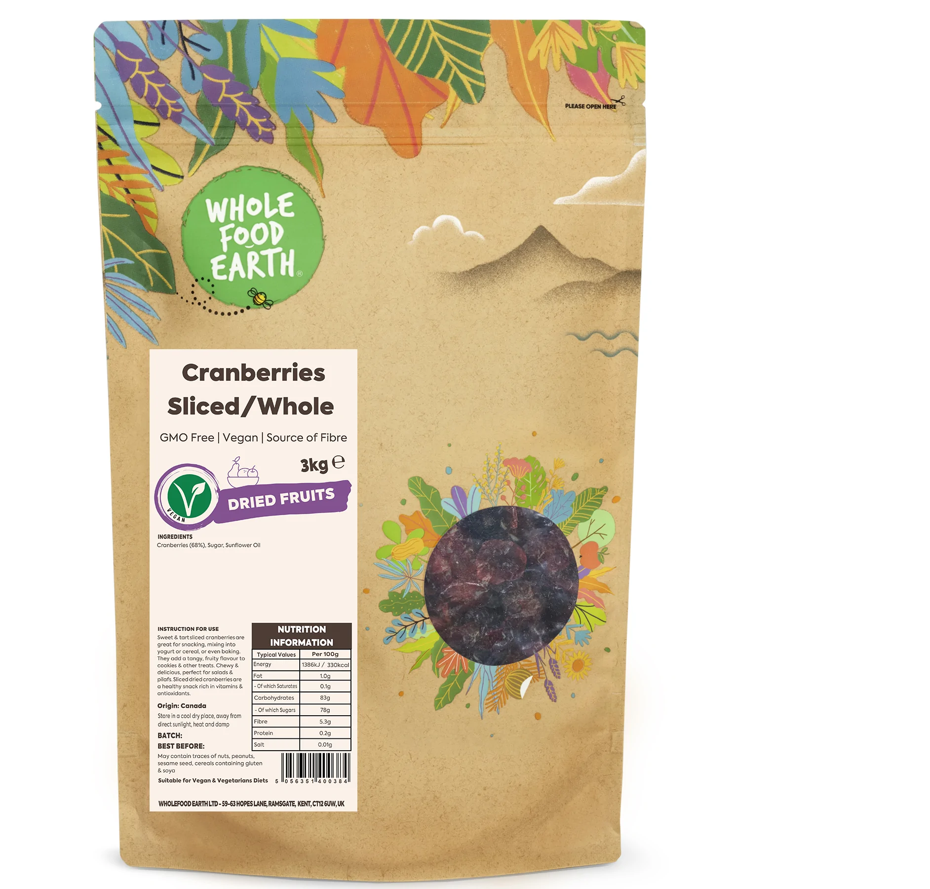 Whole/sliced cranberries are great for snacking, mixing into yogurt or cereal, or even baking. They add a tangy, fruity flavour to cookies & other treats. Chewy & delicious, perfect for salads & pilafs.