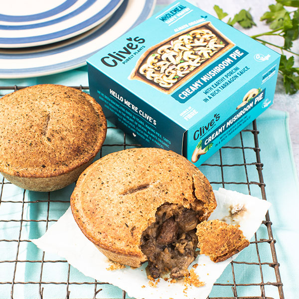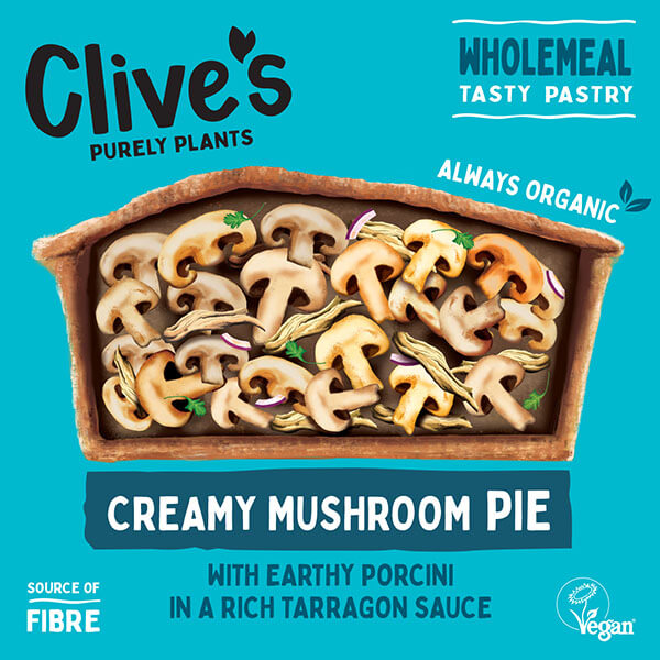 Organically produced: stoneground wholemeal WHEAT flour, chestnut mushroom (20%), onion (14%), water*, identity preserved sustainable palm oil, SOYA drink (water*, SOYA beans), non-hydrogenated margarine (sustainable palm oil, rapeseed oil, water*, coconut oil, salt*, emulsifier: sunflower lecithin, carrot juice, lemon juice concentrate, natural flavouring*), porcini mushroom (1.5%), sunflower oil, garlic, sea salt*, bouillon (salt*, rice flour, onion, parsnip, carrot, olive oil, turmeric, parsley), black pepper, tarragon, mixed herbs and love. *approved non-organic.