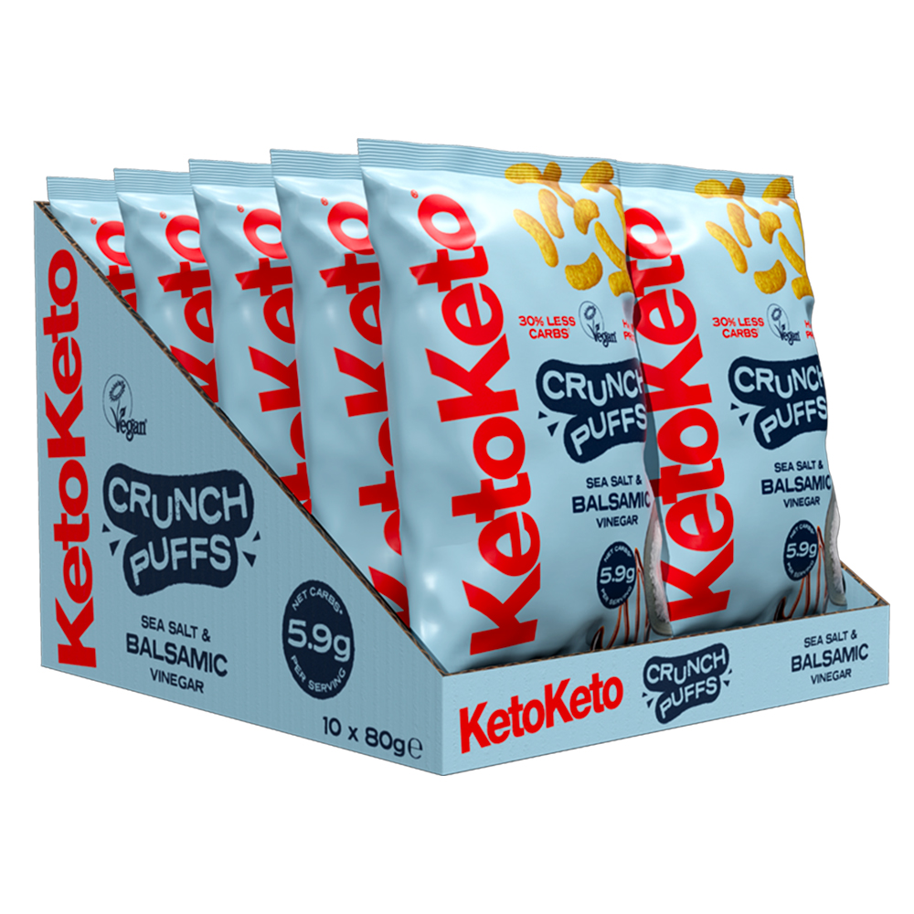 KetoKeto Crunch Puffs Sea Salt and Balsamic Vinegar. Low Carb, High Protein, Gluten Free, High in Fibre and low in Calories. Certified Vegan. The ideal Keto Crisp with only 5g net carbs per serving.
