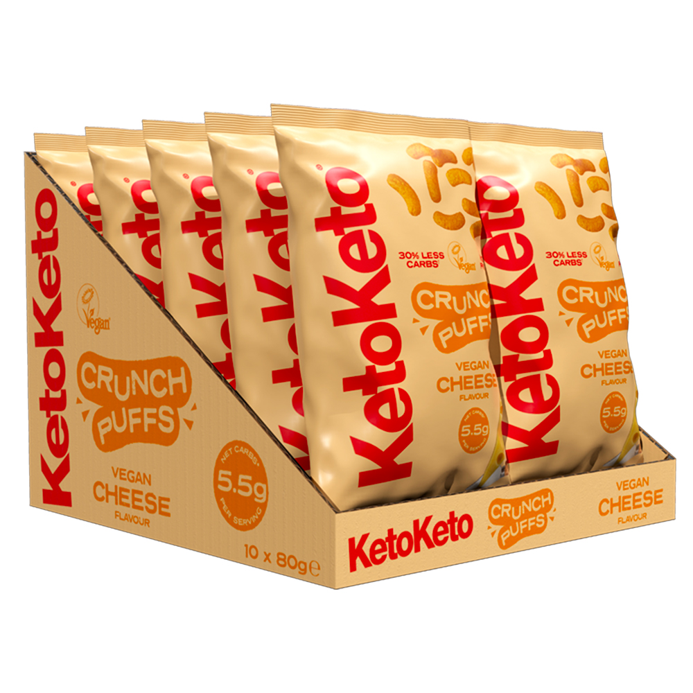 KetoKeto Crunch Puffs Vegan Cheese. Low Carb, High Protein, Gluten Free, High in Fibre and low in Calories. Certified Vegan. The ideal Keto Crisp with only 4.8g net carbs per serving.