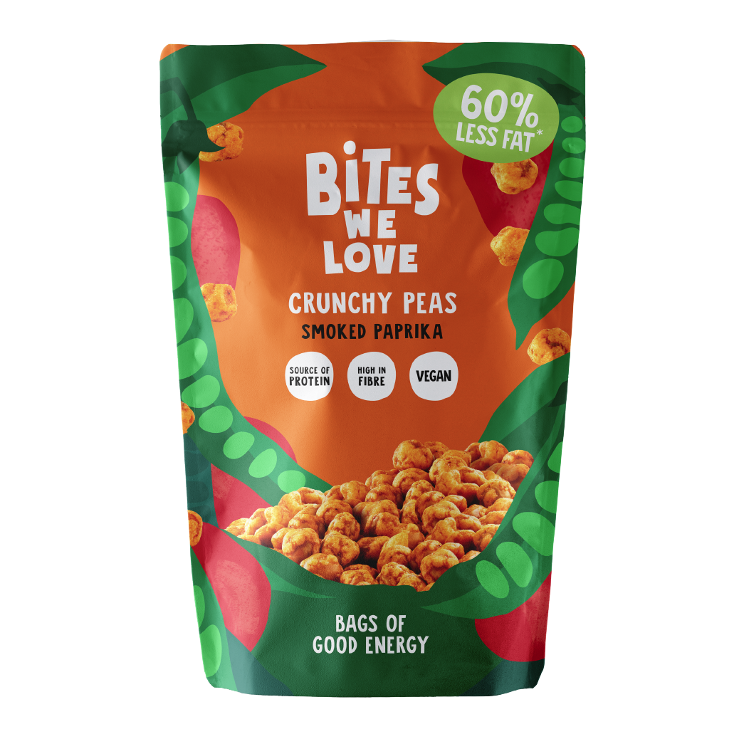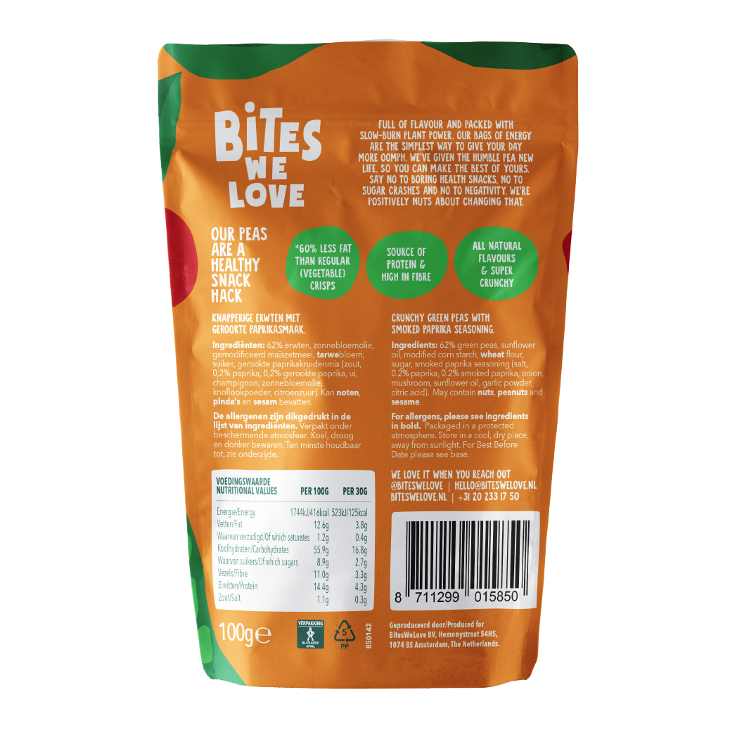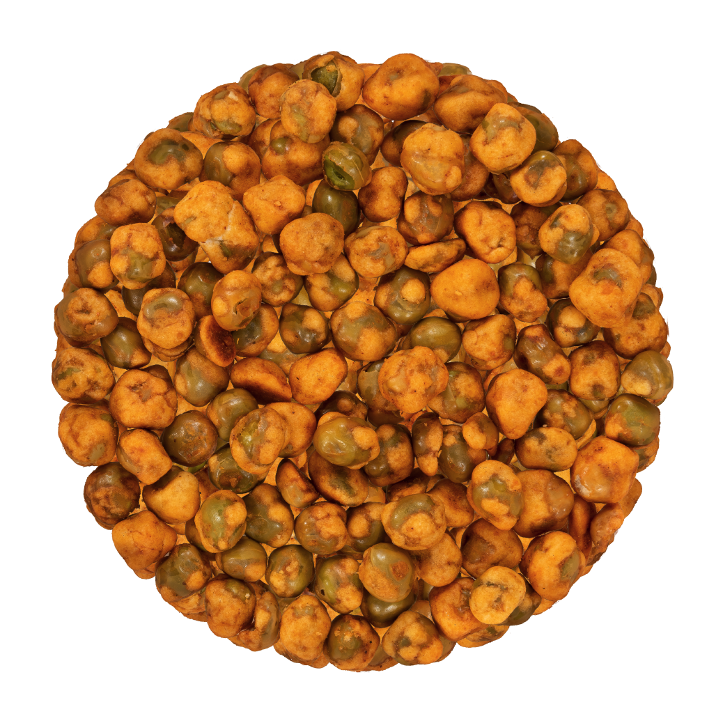 A natural snack based on roasted green peas. Flavoured with tasty sweet ’n spicy smoked Bell pepper for a full, savory taste. As tasty as a nut snack, only healthier.