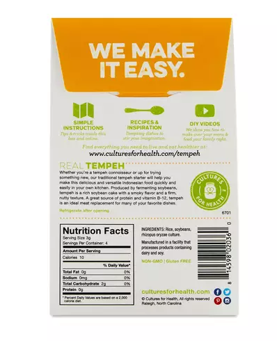 Now you can make your own tempeh at home. It’s easy with Cultures for Health Tempeh Starter Culture. Each case of 8 helps kickstart the fermentation process to produce this tasty soybean cake that’s a convenient vegan swap for meat in almost any recipe, and delivers protein and vitamin B12. Ingredients Tempeh Starter Culture Ingredients: Rice, Soy beans, Rhizopus Oryzae Culture. Each box contains...