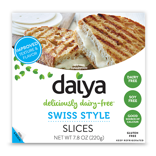 Slightly sharp, beautifully creamy and full of flavor, our Swiss Style Slices are a perfect cheese alternative. Use them to dress up a grilled cheese sandwich or enjoy them on their own. (Warning: these tasty slices can be addictive.) INGREDIENTS: Filtered water, coconut oil, potato starch, tapioca starch, sea salt, tricalcium phosphate, vegan natural flavors, pea protein isolate, xanthan gum, c...