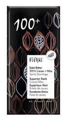 Superior Dark 100+ with cocoa nibs Santo Domingo Cacao | vegan | without added sugar The ultimate in cocoa. Just cocoa mass, cocoa butter and crunchy cocoa nibs - that's it. A good portion of cocoa butter guarantees a silky finish, despite the intensity. The soft, slightly fruity Dominican cocoa is not overpowering; instead it creates a wonderfully chocolatey explosion of flavours which - when e...