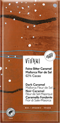 Dark Caramel, 62%, Mallorca Fleur de Sel, 80g Fine dark chocolate with 62% cocoa, crunchy caramel chips and a pinch of the popular Mallorca sea-salt "Flor de Sal d'Es Trenc".
