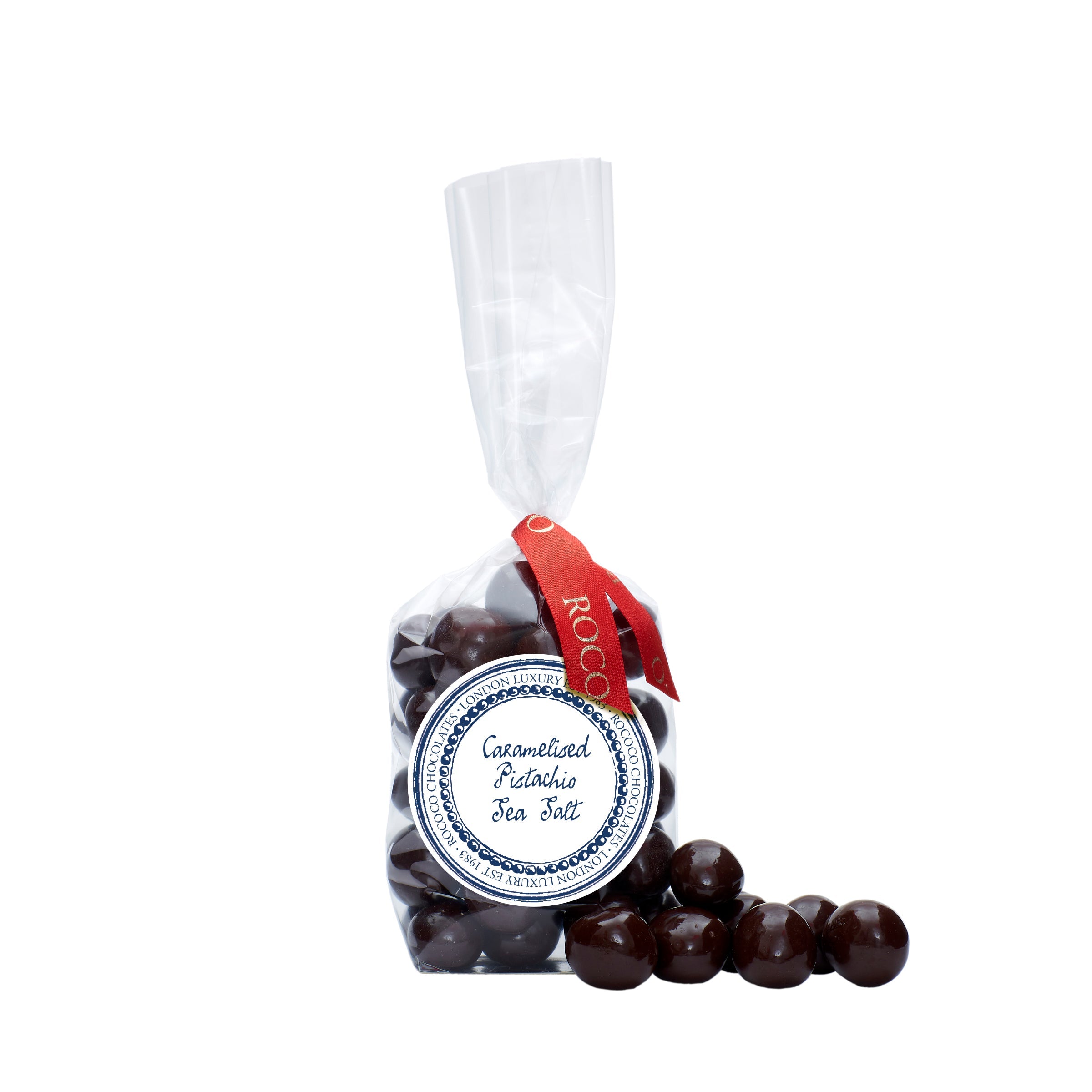 Gently caramelised pistachios are salted with Halen Mòn Salt PDO, and enrobed in 72% single origin dark chocolate from the Ivory Coast.