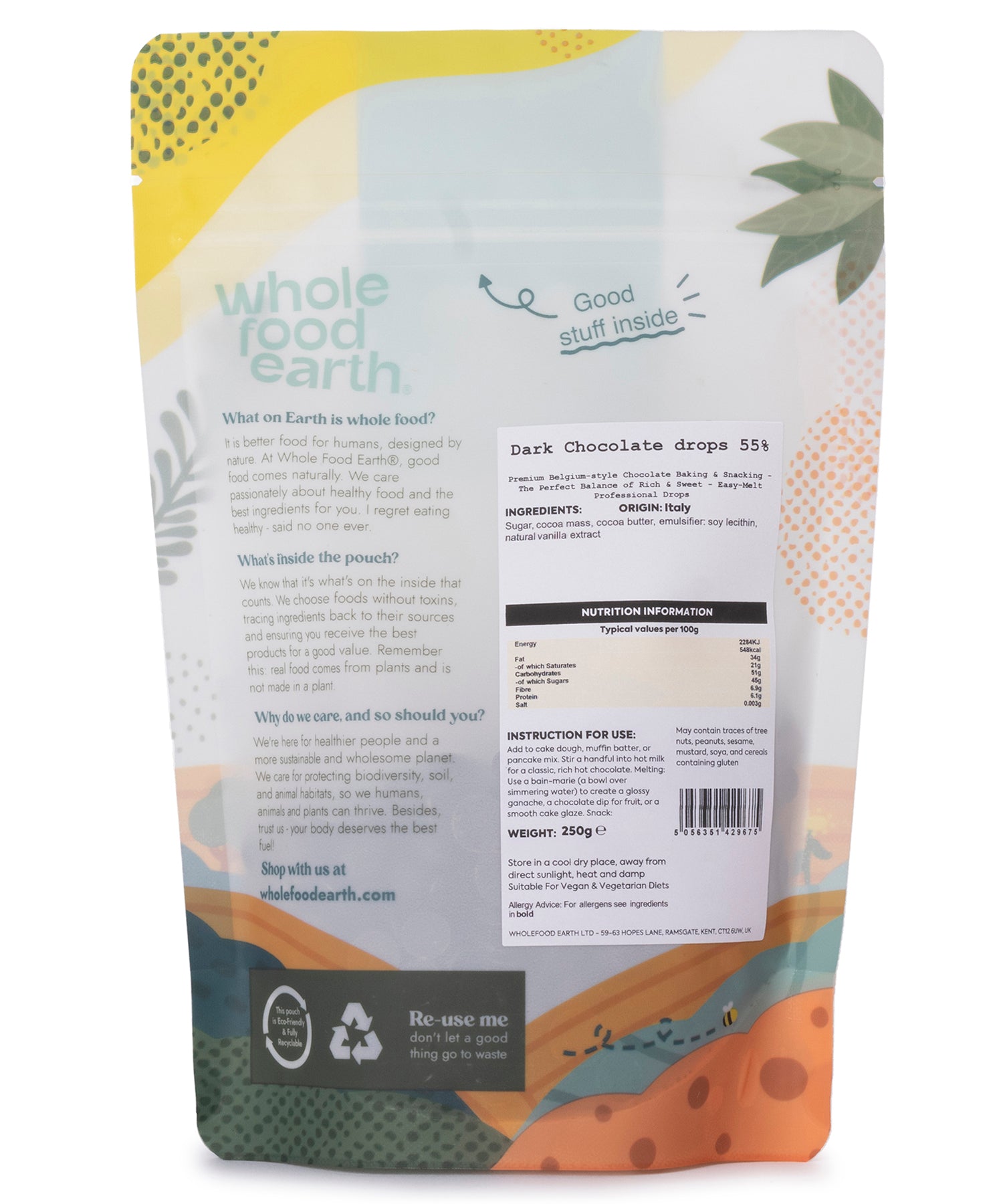 Our Dark Chocolate Drops 55% are crafted with a perfect balance of cocoa mass and cocoa butter.