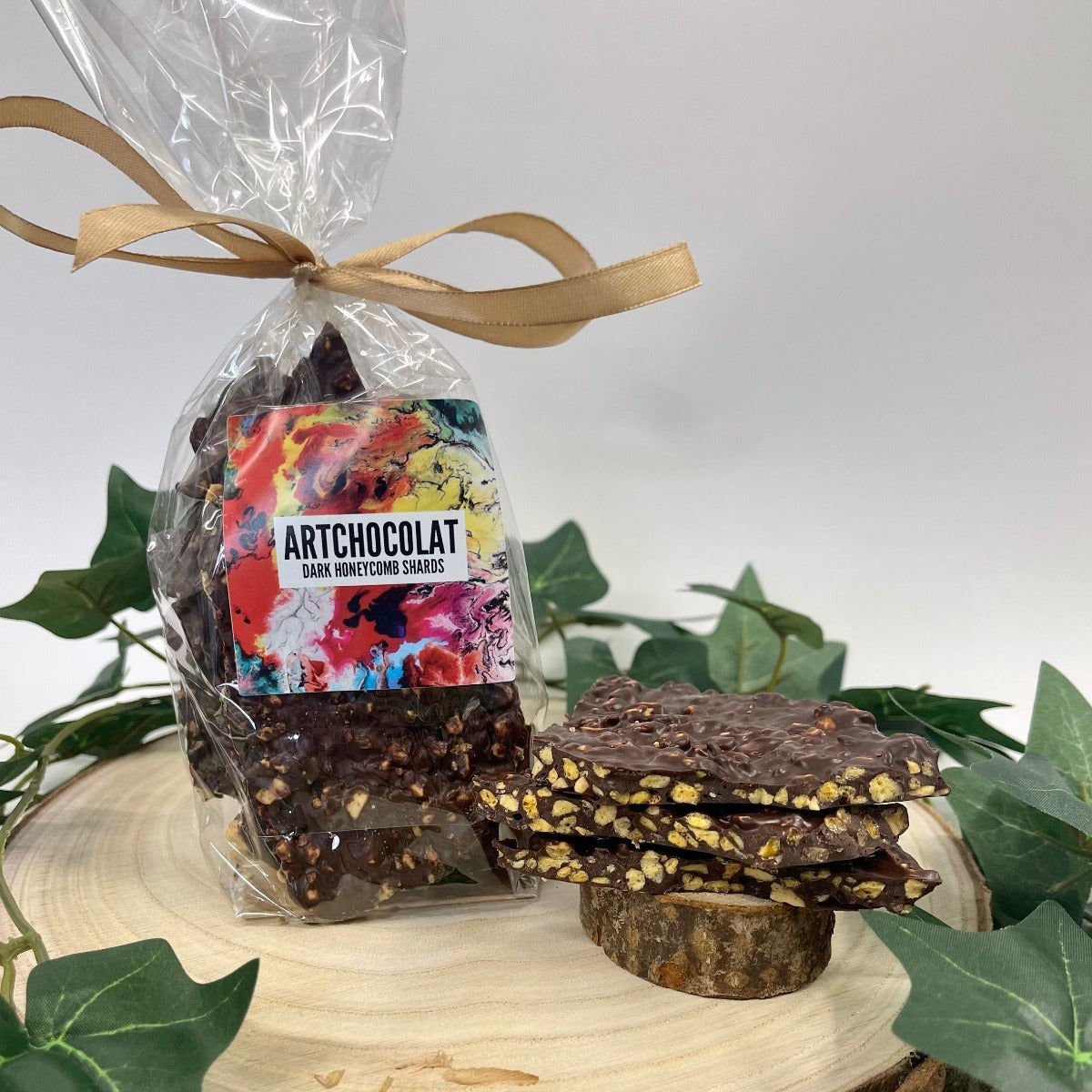 Dark chocolate pieces with honeycomb and sea salt. A delicious moreish combination.