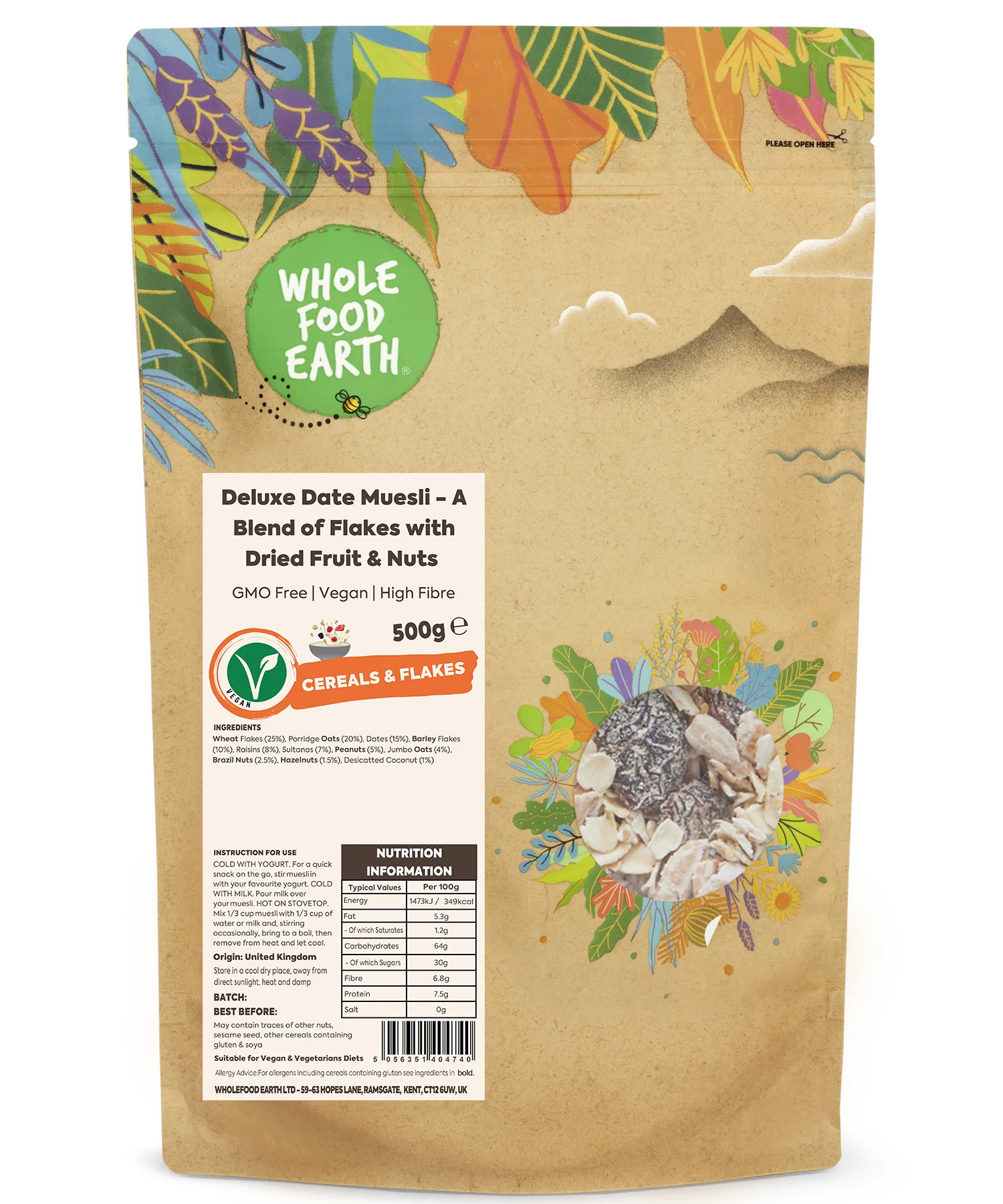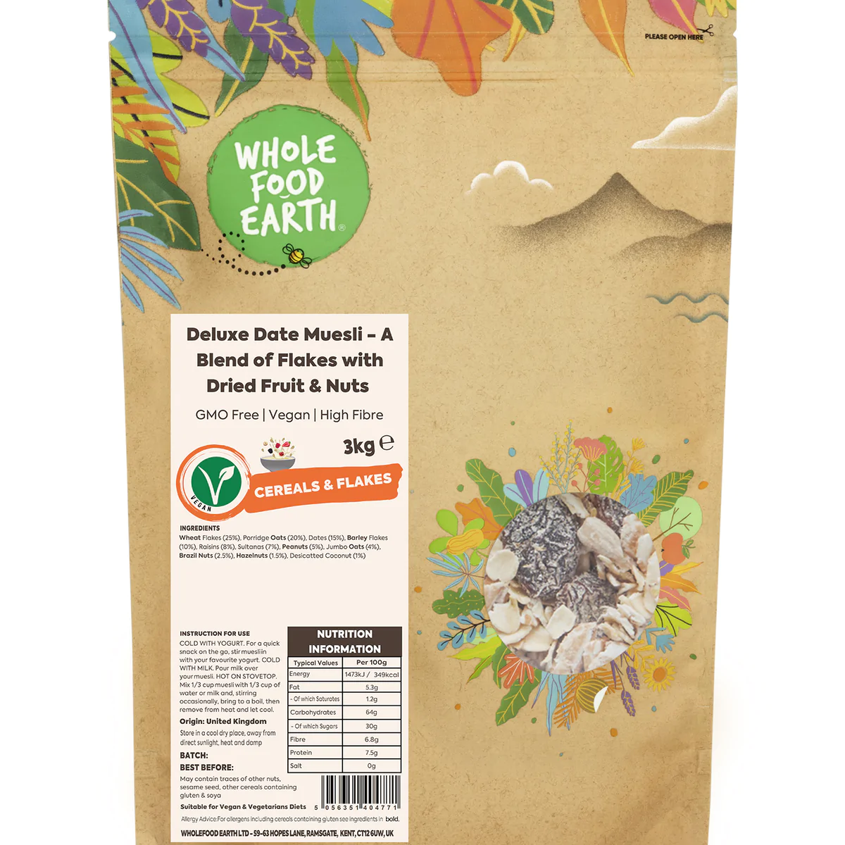 Our Deluxe Date muesli is a carefully selected and finely crafted blend of Dates, Wheat Flakes, Porridge Oats Fruit and Nuts, Including Raisins & Hazelnuts! (for full list, please read below)