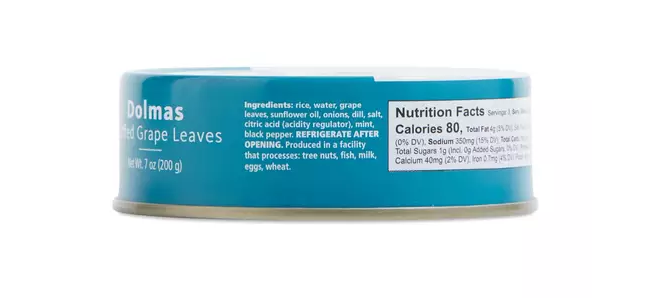 Dolmas are the centerpiece of the Greek mezé tradition. Soft and tender grape leaves wrap rice seasoned with sweet onions, fresh dill, and mint. A product of Greece. Ingredients rice, water, grape leaves, sunflower oil, onions, dill, salt, citric acid (acidity regulator), mint, black pepper.
