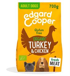 Organic Turkey & Chicken, organic carrot, pear & chia seeds 700g. This gluten-free recipe is full of fresh, free-range and organic turkey and chicken, so it's an amazing source of high-quality protein (and contains no dried or dehydrated meat). Organic meat has higher welfare standards, which means plenty of fresh air and space for animals to thrive. We blend our recipes with a super-healthy mix o...
