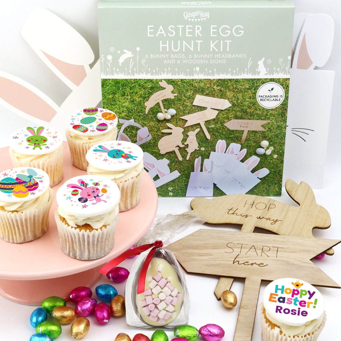 Create your own Easter egg hunt with this colourful gift hamper, perfect for an Easter party! No Easter celebration is complete without delightful treats, and our set includes six decadent cupcakes adorned with festive decorations, perfect for sharing joy with loved ones. You can even personalise with up to 2 names.