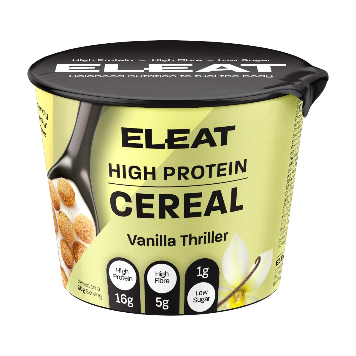 ELEAT is the balanced, high protein cereal to fuel your everyday. Each 50g serving is high in protein (15g), high in fibre (7g - including added prebiotics), low in sugar (1g), vegan friendly and gluten-free.