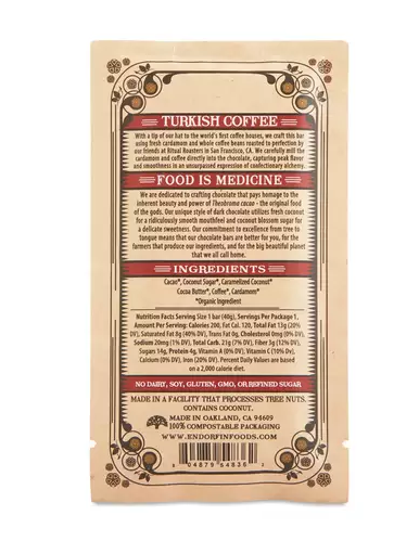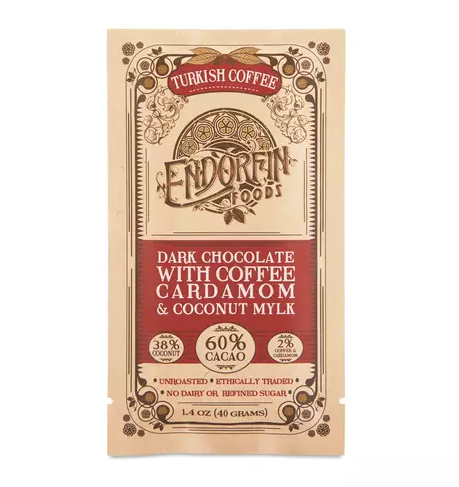 With a tip of their hat to the world’s first coffee houses, Endorfin Foods crafts their Turkish Coffee chocolate bar using fresh cardamom and whole coffee beans roasted to perfection by their friends at Ritual Coffee Roasters in San Francisco, CA. They carefully mill the cardamom and coffee directly into the chocolate, capturing peak flavor and smoothness in an unsurpassed expression of confection...