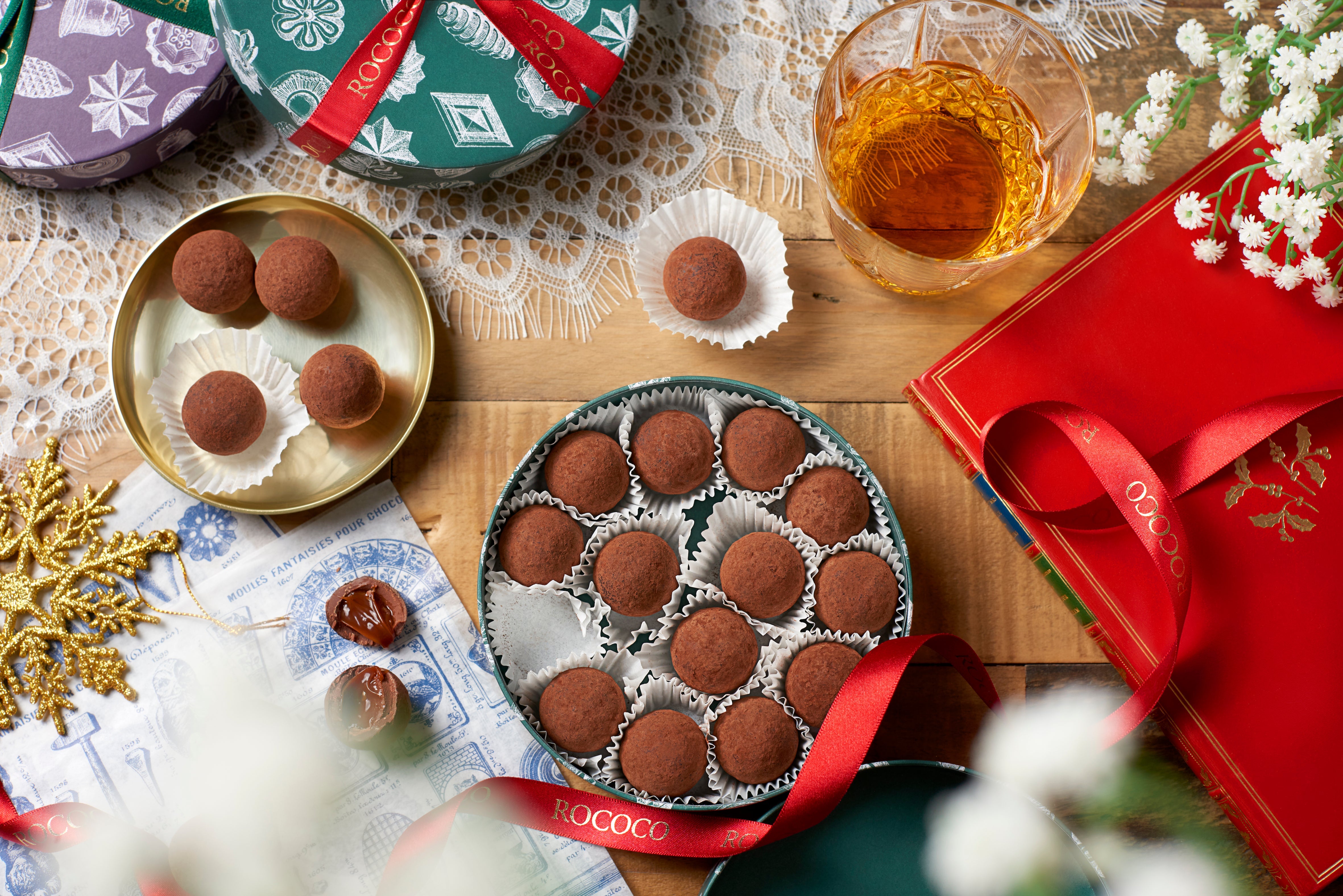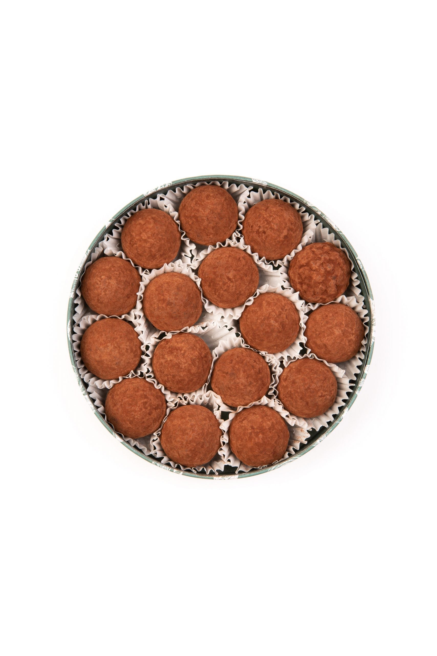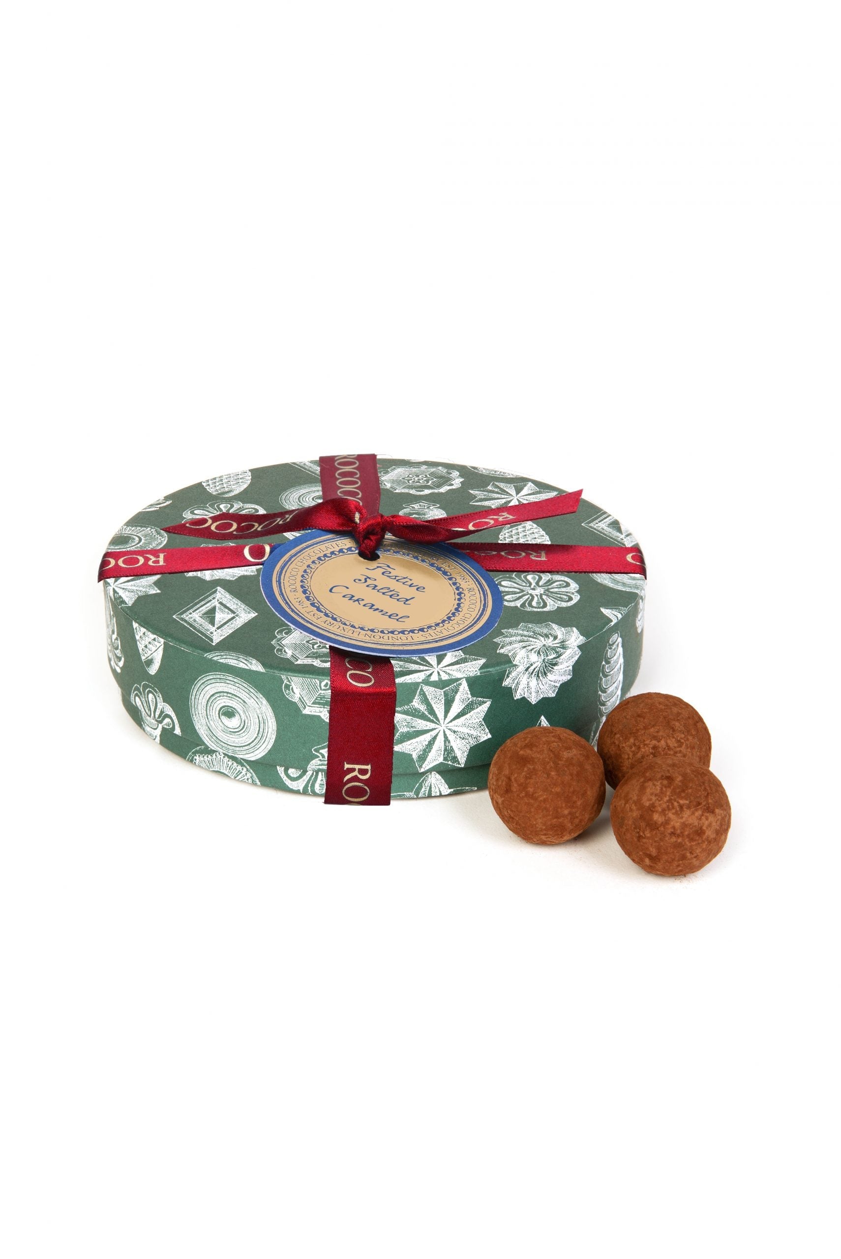 Our signature silky salted caramel encased in milk chocolate and dusted with cocoa, nestled in a fir green Rococo Christmas toile gift box.