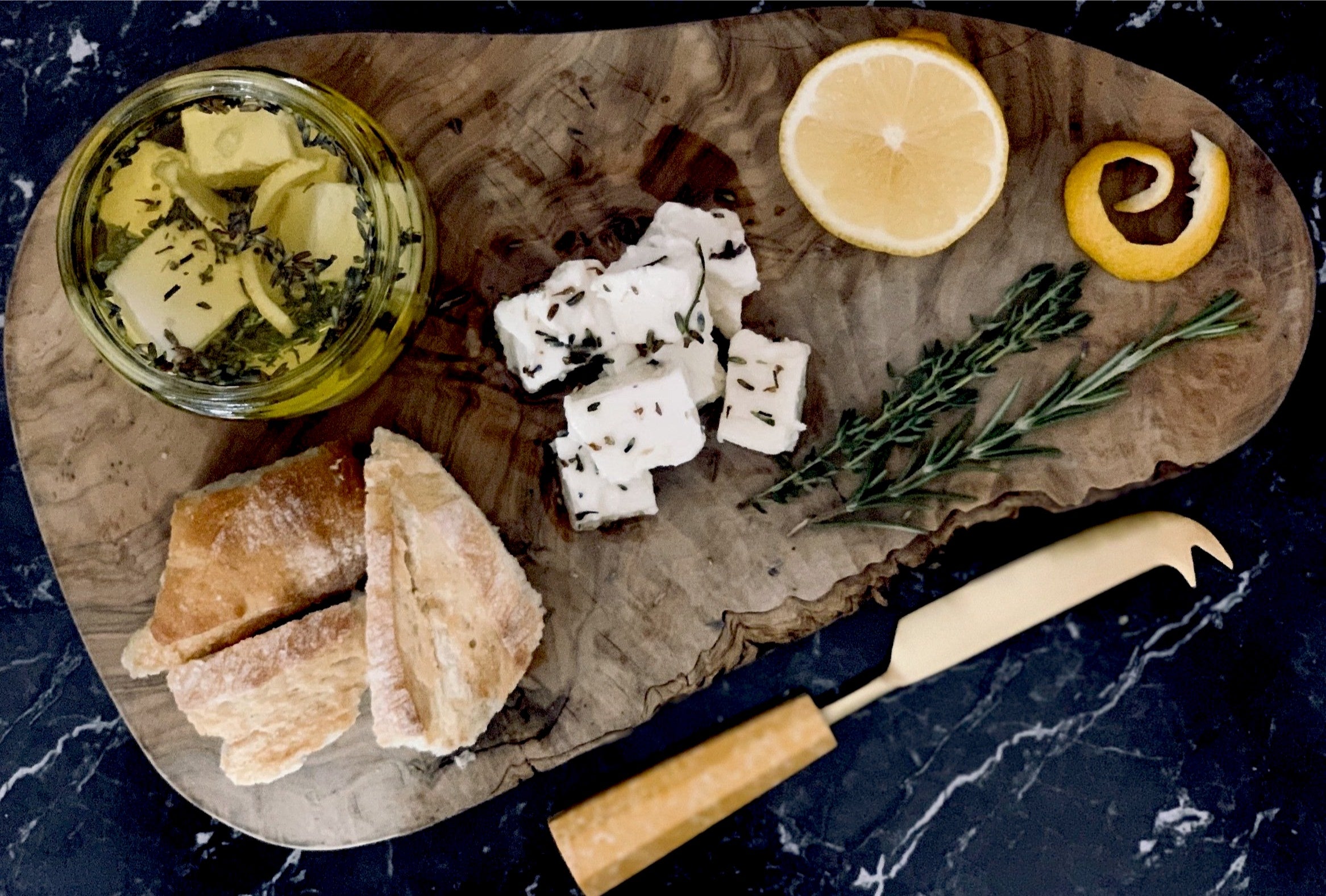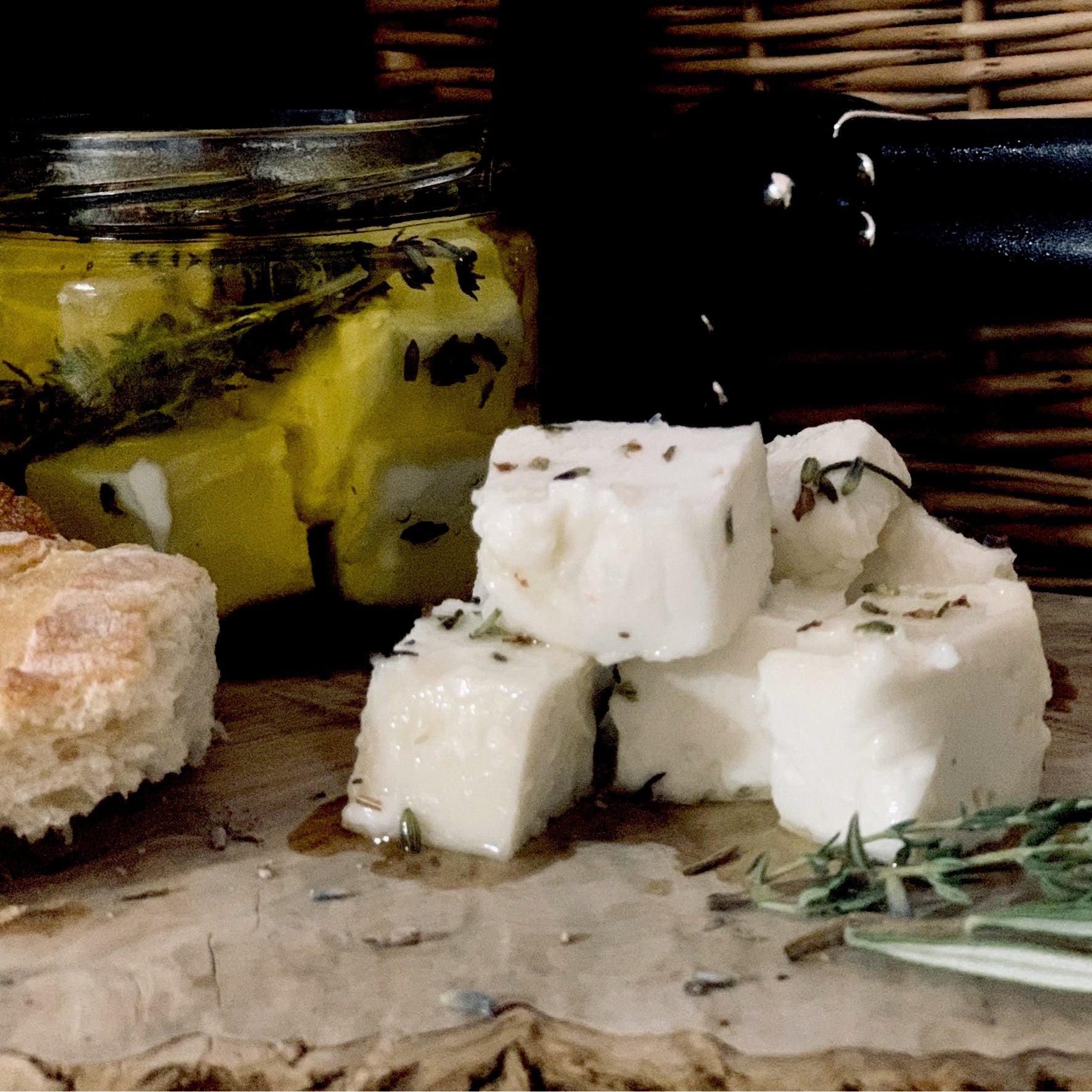 A deliciously tangy, soft and crumbly goat-style cheese marinated in citrus and herb-infused oil.