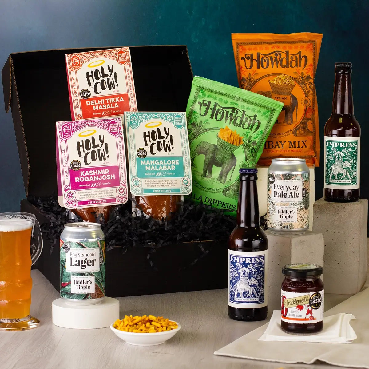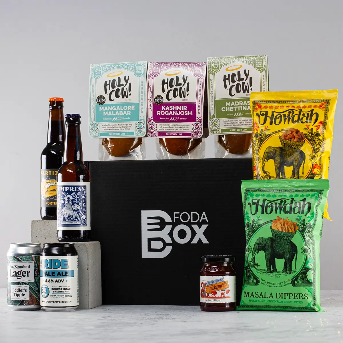 Inspired by the British tradition of curry night, this gift offers a trio of Holy Cow!'s award-winning curry sauces, from mild heat to hot, for an authentic homemade curry that's ready in minutes. Partnered with a delicious spicy chilli jam and a selection of FodaBox's favourite craft beers to suit.