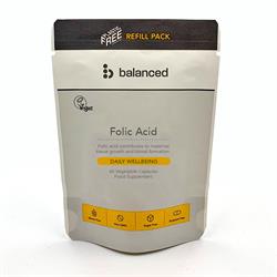 Balanced Folic Acid 60 Veggie Caps in our 100% recyclable paper refill pouch. Folic acid contributes to maternal tissue growth and blood formation. Vegan and free from excipients, soy, GMO, gluten, lactose and sugar. For nutritional information and ingredients, click Further Information.