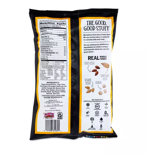 Flax, sunflower and sesame seeds add to the distinctively nutty flavor, making this chip a wholesome, perfect snack to be enjoyed on its own or dipped into your favorite hummus. Ingredients Stone Ground Corn, High Oleic Sunflower Oil and/or Safflower Oil and/or Canola Oil, Brown Rice Flour, Flax Seeds, Cane Sugar, Sesame Seeds, Sunflower Seeds, Quinoa, Sea Salt, Rosemary Extract.