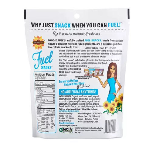 A delicious and healthy snack crisp for when you are on the go. Foodie Fuel’s Coconut Vanilla Super Snacker Crisps provide decadent taste, sweet deliciousness and nutritional benefits to your on the go routine. Why just snack when you can fuel! Ingredients Organic sunflower seeds, organic coconut sugar, organic golden flax seeds, organic coconut, organic pumpkin seeds, organic toasted coconut fl...