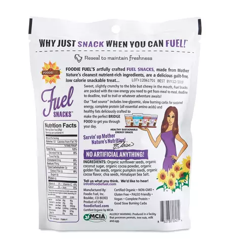 A delectable chocolate flavor that will fill your body with a sense of deep satisfying goodness. Made with cacao nibs and organic cocoa powder, the Swiss Chocolate Snacker Crisps are dangerously delectable with a superbly salted, chocolatey taste. Ingredients Organic sunflower seeds, organic coconut sugar, organic cocoa powder, organic golden flax seeds, organic pumpkin seeds, organic cocoa flavo...
