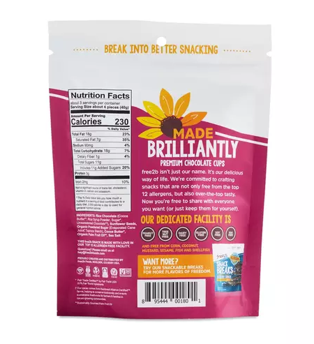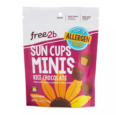 Free2Be Rice Chocolate Sun Cup Minis are like giving candy to a baby. These perfectly-sized treats are great for little hands and are free of the top 12 allergens, including peanut butter. Instead they combine better-for-you rice chocolate with minimally-processed sunflower seed butter. All ingredients are non-GMO, vegan, and fair trade certified. Ingredients Rice chocolate (cocoa butter, rice s...