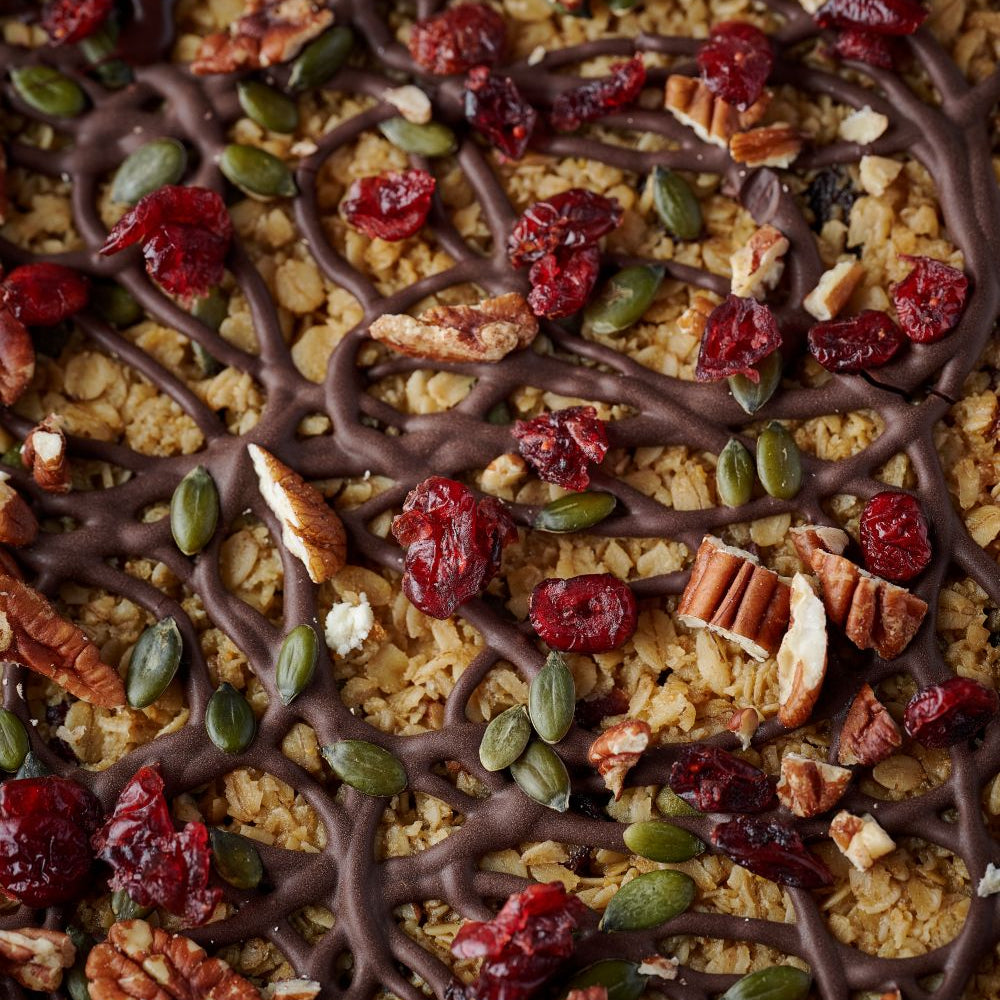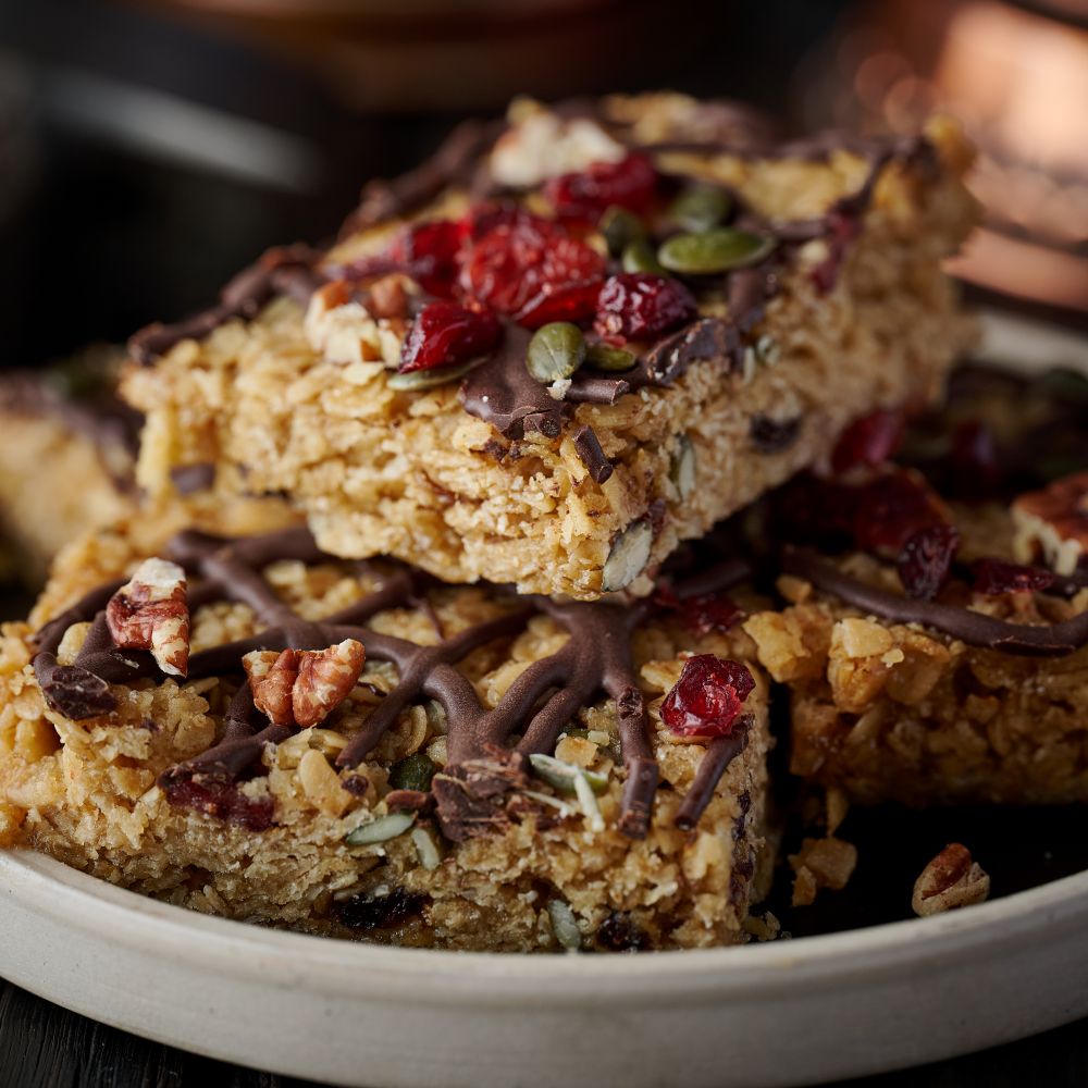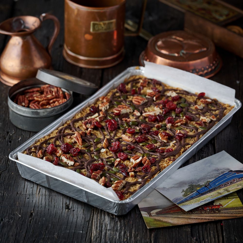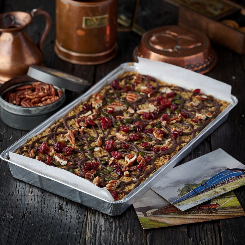 A flapjack baked with sultanas, cranberries, pecans, and pumpkin seeds. Topped with a layer of dark chocolate and finished with a scattering of fruit and nuts for a deliciously indulgent bite.