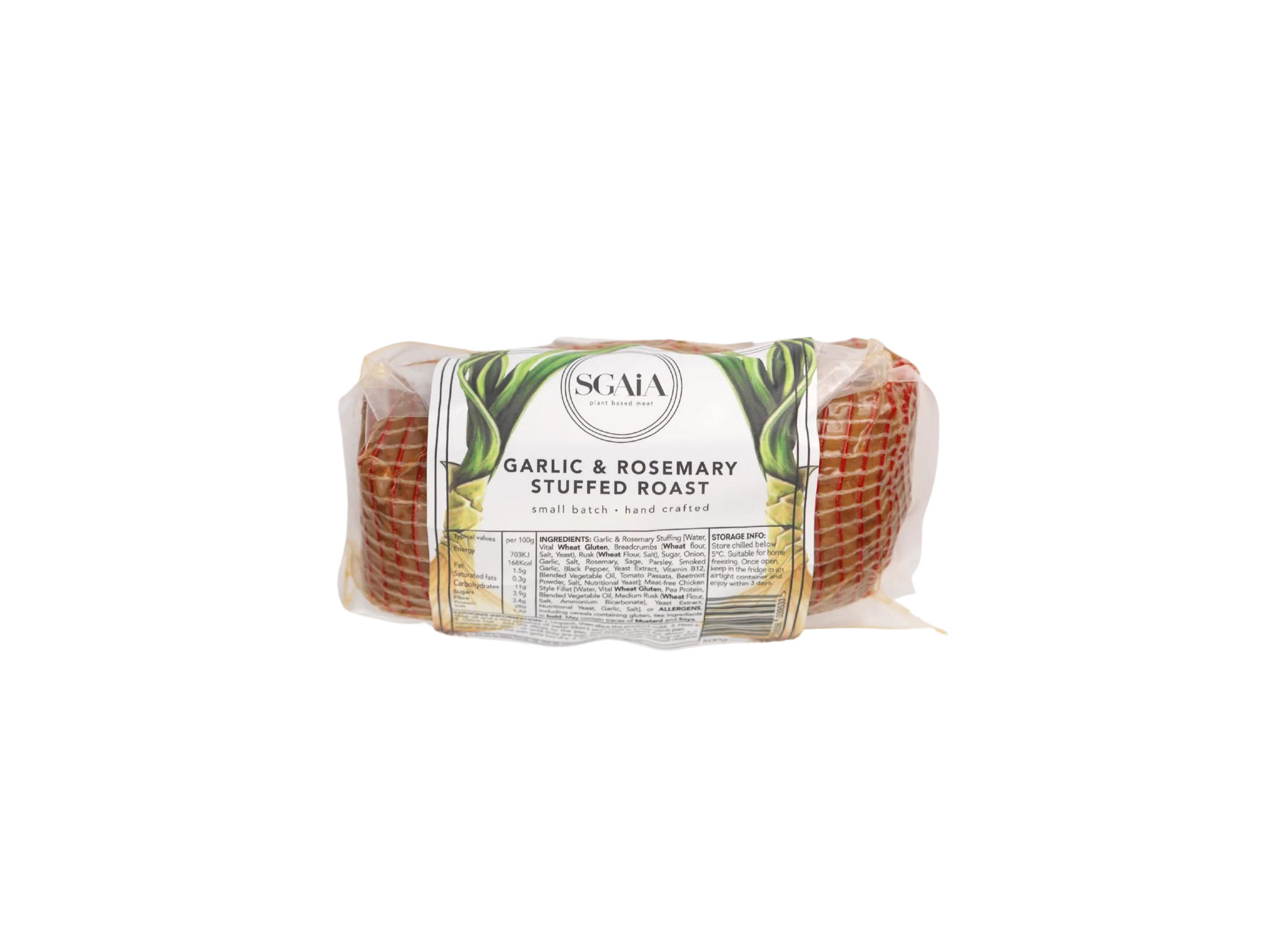 Ingredients: Garlic & Rosemary Stuffing [Water, Vital Wheat Gluten, Breadcrumbs (Wheat flour, Salt, Yeast), Rusk (Wheat Flour, Salt), Sugar, Onion, Garlic, Salt, Rosemary, Sage, Parsley, Smoked Garlic, Black Pepper, Yeast Extract, Vitamin B12, Blended Vegetable Oil, Tomato Passata, Beetroot Powder, Salt, Nutritional Yeast]; Meat-free Chicken Style Fillet [Water, Vital Wheat Gluten, Pea Protein, Blended Vegetable Oil, Medium Rusk (Wheat Flour, Salt, Ammonium Bicarbonate), Yeast Extract, Nutritional Yeast, Garlic, Salt].