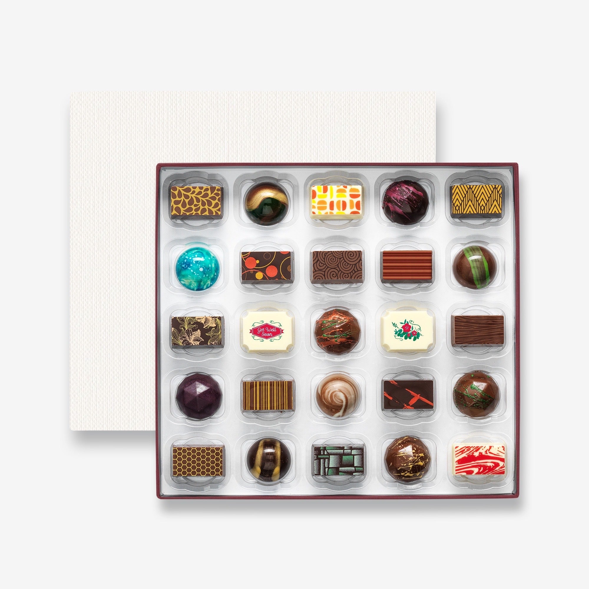 A luxury selection box of 25 filled artisan chocolates, featuring two special 'Get Well Soon' themed chocolates. Made with natural ingredients and hand-decorated with cocoa butter.