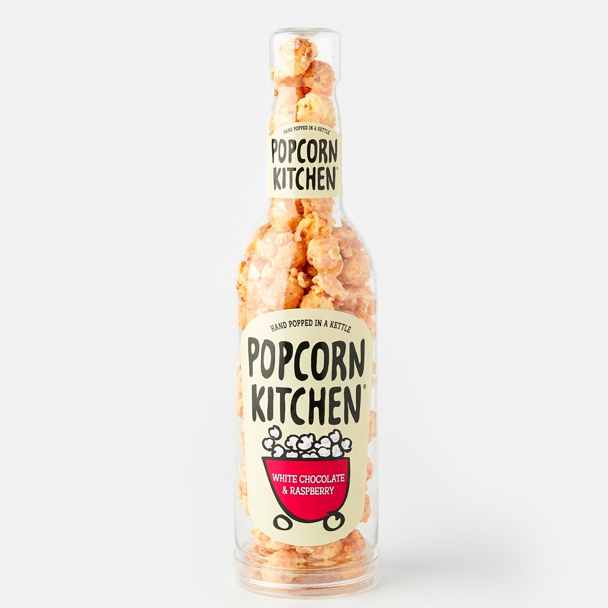 Popped Corn, Sugar, Glucose Syrup, White Chocolate (19%)(Sugar, Cocoa Butter, Whole Milk Powder, Emulsifier: Soya Lecithin, Natural Vanilla Flavour), Butter (contains Milk), Dried Raspberries, Rapeseed Oil, Salt, Emulsifier: Soya Lecithin, Raising Agent: Bicarbonate of Soda, Natural Flavouring. Milk solids 14% minimum. Contains: Milk and Soya.