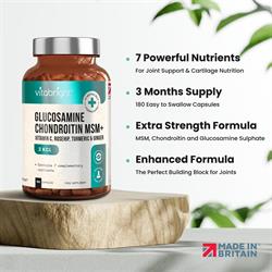 Why is it so good? 180 Fast Absorbing Capsules - VitaBright's Glucosamine Chondroitin Complex with MSM provides incredible value for money, delivering 3 months supply of advanced health nutrition in easy to swallow fast-release capsules. High Strength Formula - A potent 1115mg of high-quality glucosamine expertly blended with chondroitin, MSM, turmeric, vitamin c, ginger and rosehip. Scientifi...
