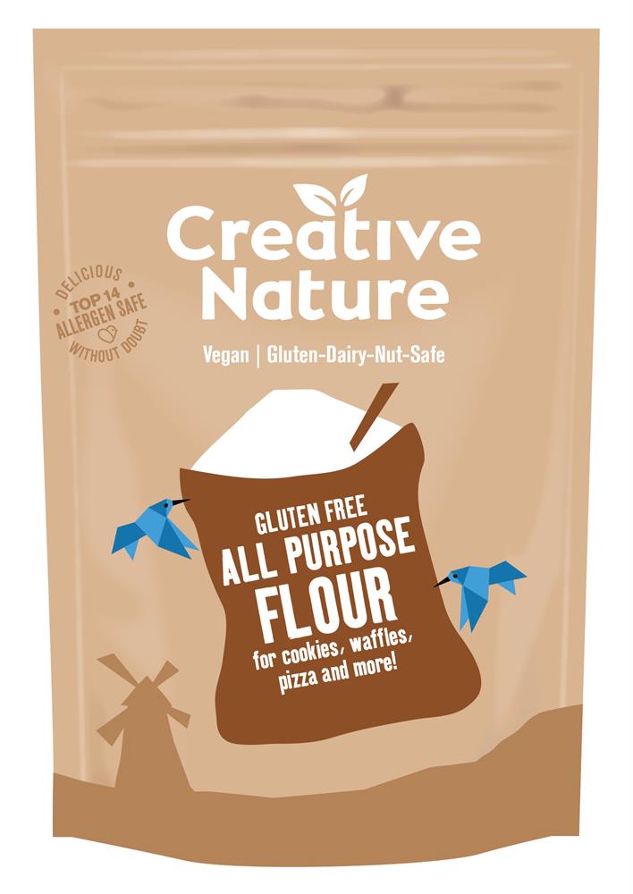 Creative Nature Gluten Free All Purpose Flour. Our blend consists of rice flours which are versatile for baking, provide high amounts of fibre as well as nutrients ; buckwheat (which doesn't actually contain gluten or wheat) providing an earthy flavour and contributing to several diverse baking properties, and finally maize flour (milled dried corn kernels), best used in tortillas, breads and muff...