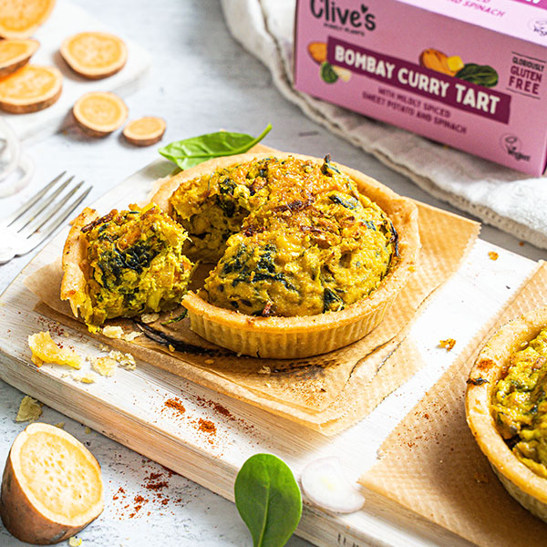 Gluten Free pastry case packed with green pepper, sweetcorn, spinach, sweet potato, and mildly spiced coconut cream curry. A sweet potato twist on a curry classic. Add a little oomph to your lunch or spice to your supper. Pretty special on its own or plate up with a simple salad and a dollop of mango chutney.