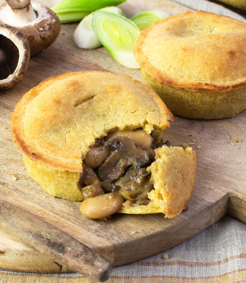 Gluten free pastry crust filled with mushrooms, leeks, creamy butterbeans and herbs. Mellow mushroom is here to warm your day. With braised leeks and earthy butterbeans, these deep flavours go well with hearty mash and roasted root veg.