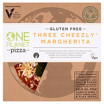 One Planet Pizza’s hand crafted artisan gluten free lab pizza with homemade tomato sauce, mature cheddar and red cheddar style cheezly, buffalo tomatoes, topped with mozzarella style cheezly **please note this item is discounted as it has exceeded its best before date, although still safe to consume it may affect the quality.