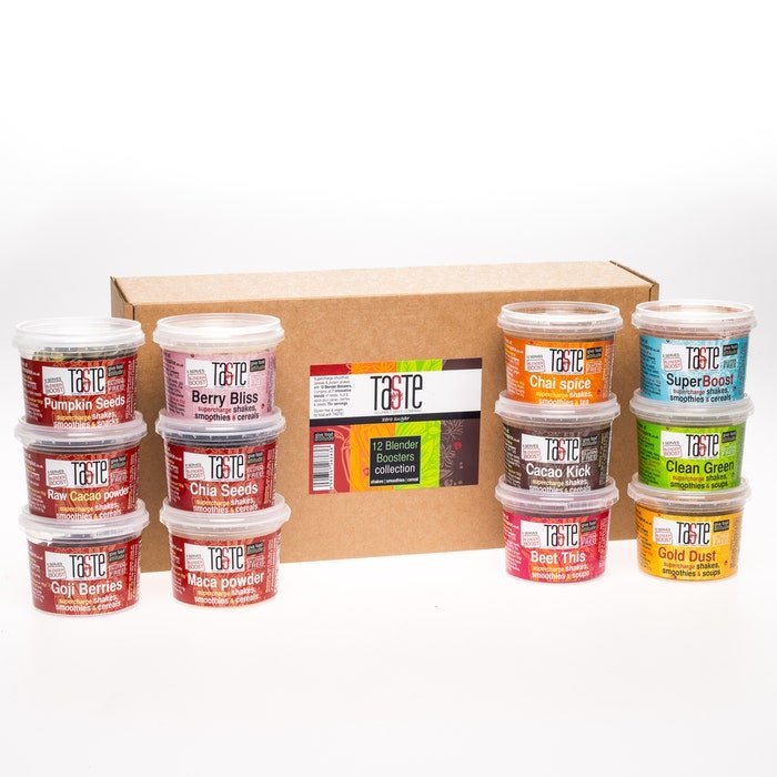 Containing all 7 of our innovative Blender Boosters plus a 5 full-size pots of incredibly nutritious boosters, including raw Cacao Power, Maca powder & Chia Seeds. Just adding 1-2 tsp of any of these blends to your smoothie in the morning will kickstart your metabolism & set you on the path to pure flavour!
