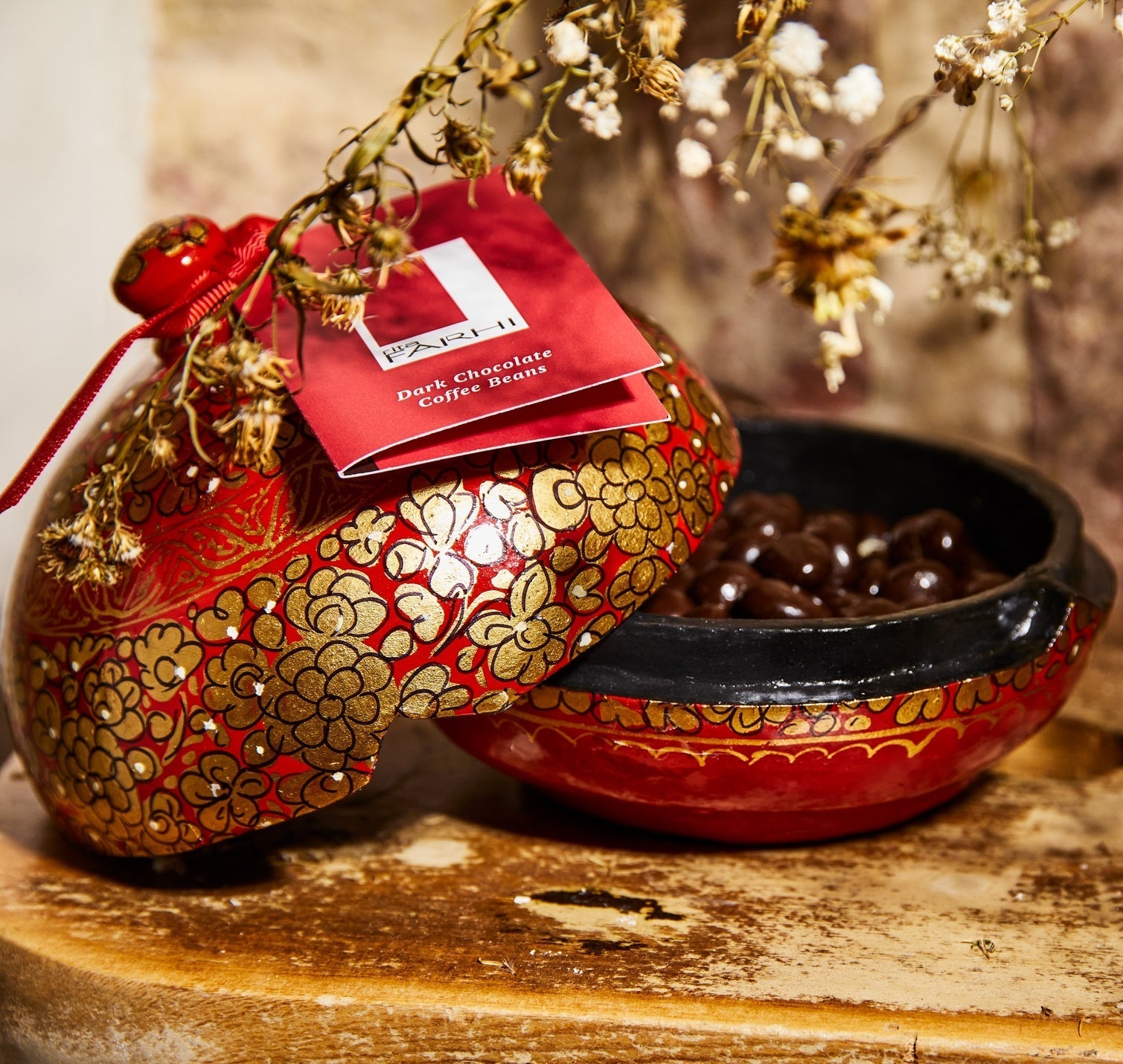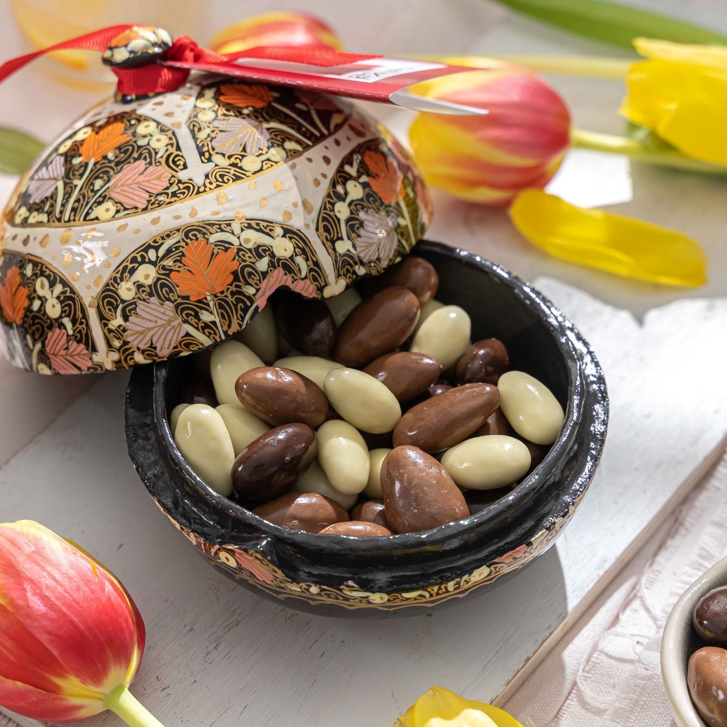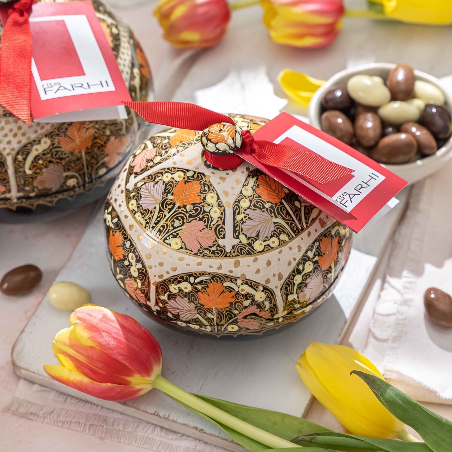 Our bonbonnières were inspired by a European tradition from centuries ago, where the host of a celebration offered their guests a little box (or a bonbonnière) made from porcelain, crystal or silver, containing delicacies made from sugar. Given out at special events such as weddings, christenings and birthdays, they were designed to bestow good luck on the guests. Rita Farhi Bonbonnières are made from papier mâché and hand painted creating a beautiful and truly unique gift. Filled with aromatic Brazilian coffee beans wrapped in sumptuous dark chocolate these stunning boxes make for a stand-out celebratory gift. In a range of elegant designs these beautiful, luxurious keepsake gift bonbonnières will be treasured long after the delicious chocolate is gone.