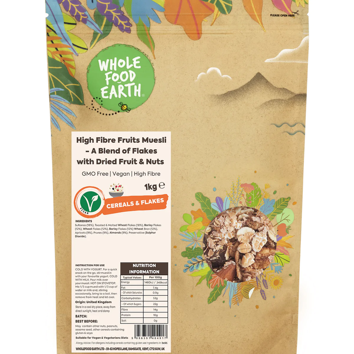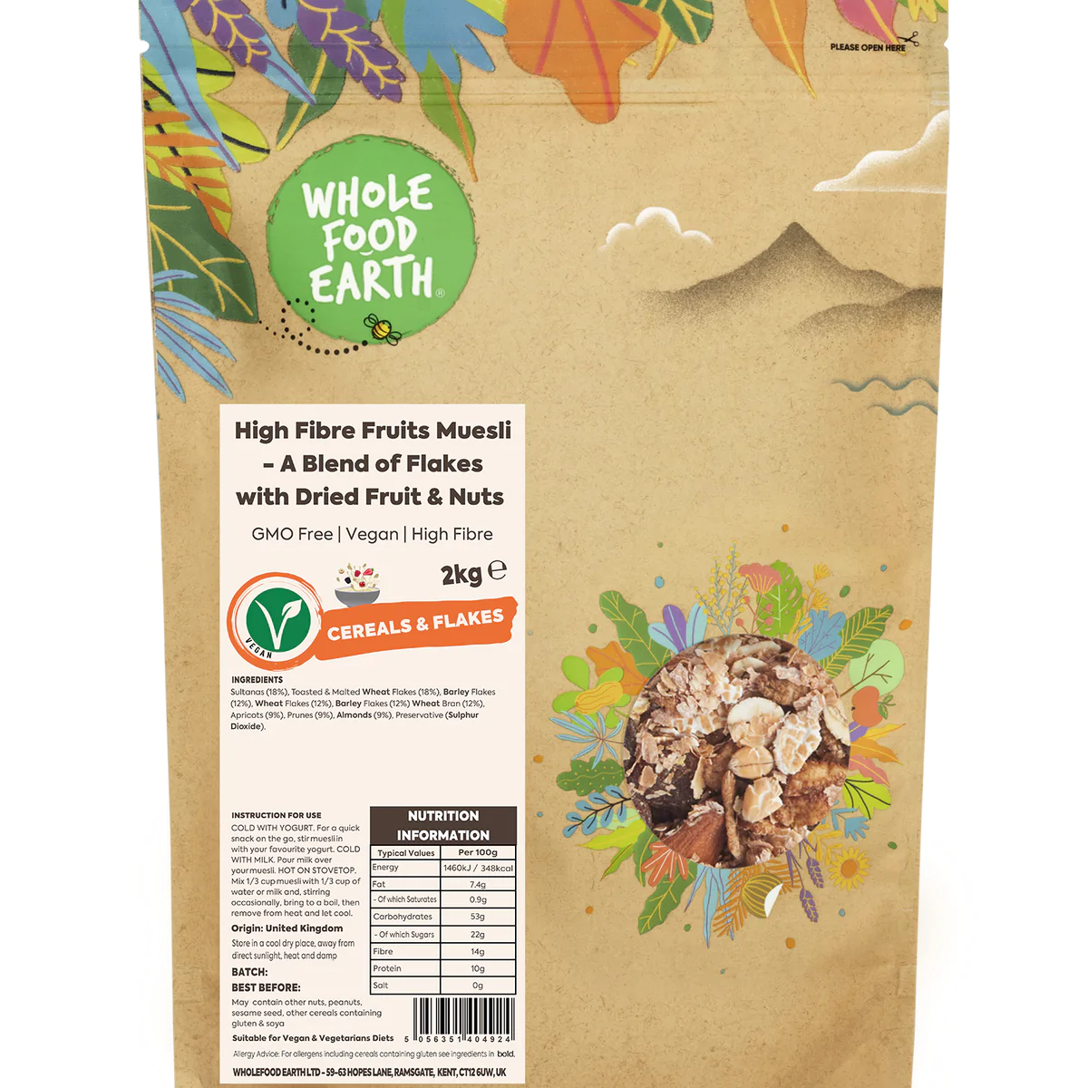 Our High Fibre Fruits Muesli is a carefully selected and finely crafted blend of Toasted & Malted Wheat Flakes, (Gluten), Sultanas, Barley Flakes, Bran, Wheat Flakes, Apricots, Almonds, Pitted Prunes (full ingredients below)