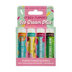 Crazy Rumors mix pack is a beautifully presented collection of 4 lip balms ready for gift giving ...or keeping! 100% natural and vegan ultra moisturising lip balms. Each lip balm is 4g Ice Cream Mix - 4 pack (Orange Creamsicle, Banana Split, Raspberry Sorbet, Mint Chocolate) Decadent ice-cream inspired flavours. Drip proof guaranteed!