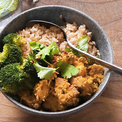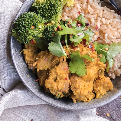 Slow cooked Jackfruit Rendang served with brown rice, this fragrant Malaysian dish bursts with fresh lemongrass, ginger and toasted coconut.