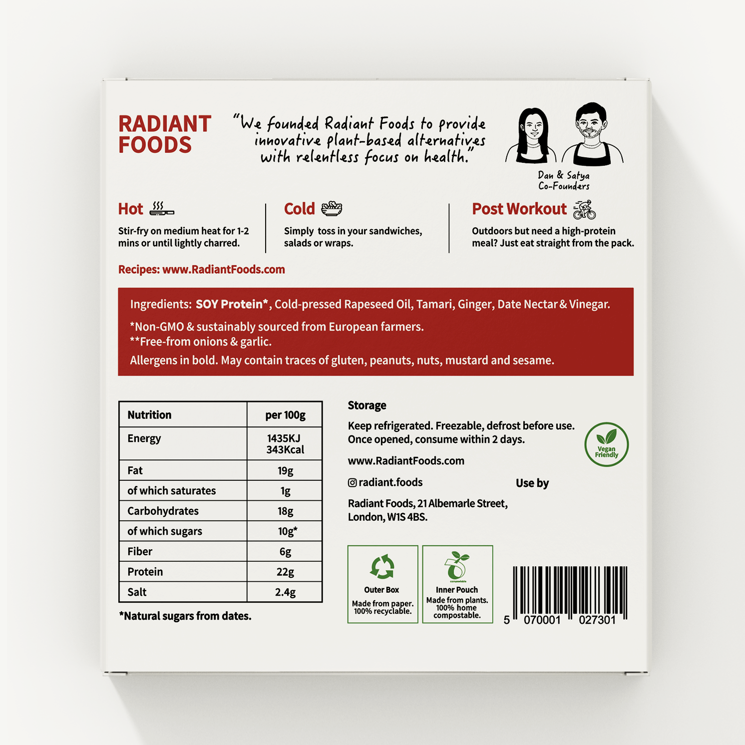 Ingredients: SOY protein*, Cold-pressed Rapeseed Oil, Tamari, Ginger, Date Nectar & Vinegar.