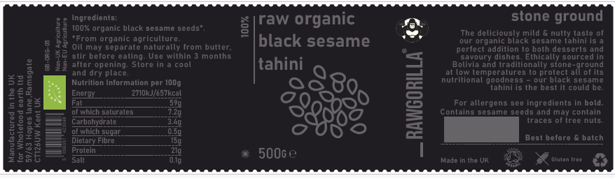 Label - raw organic black sesame tahini - RAWGORILLA
