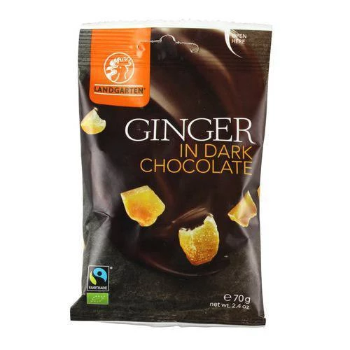 Landgarten's Ginger in Dark Chocolate is the perfect contrast of long-lasting flavour and refreshingly enticing tang. Vegan friendly, this sumptuous treat is the resulting combination of organically grown fruits, fair trade chocolate and the very best in gluten free ingredients. Send your taste buds into a frenzy and experience the best in healthy snacking, with Landgarten's Ginger in Dark Chocola...
