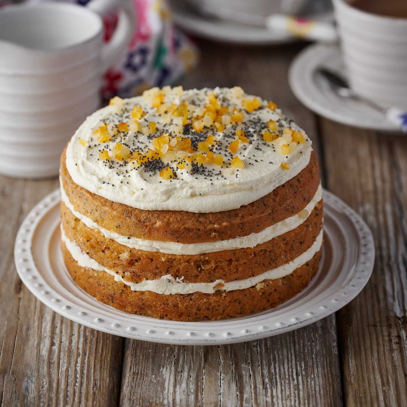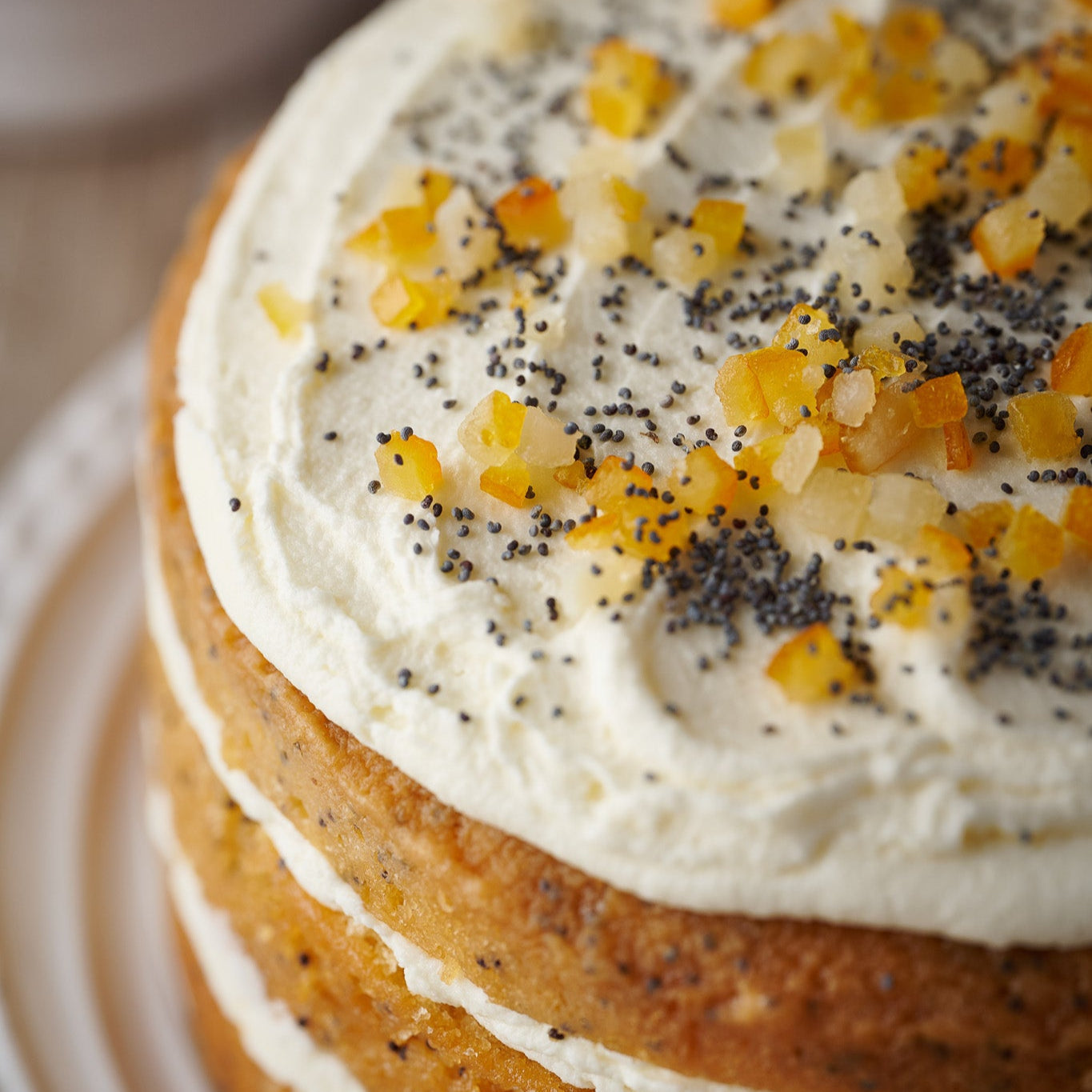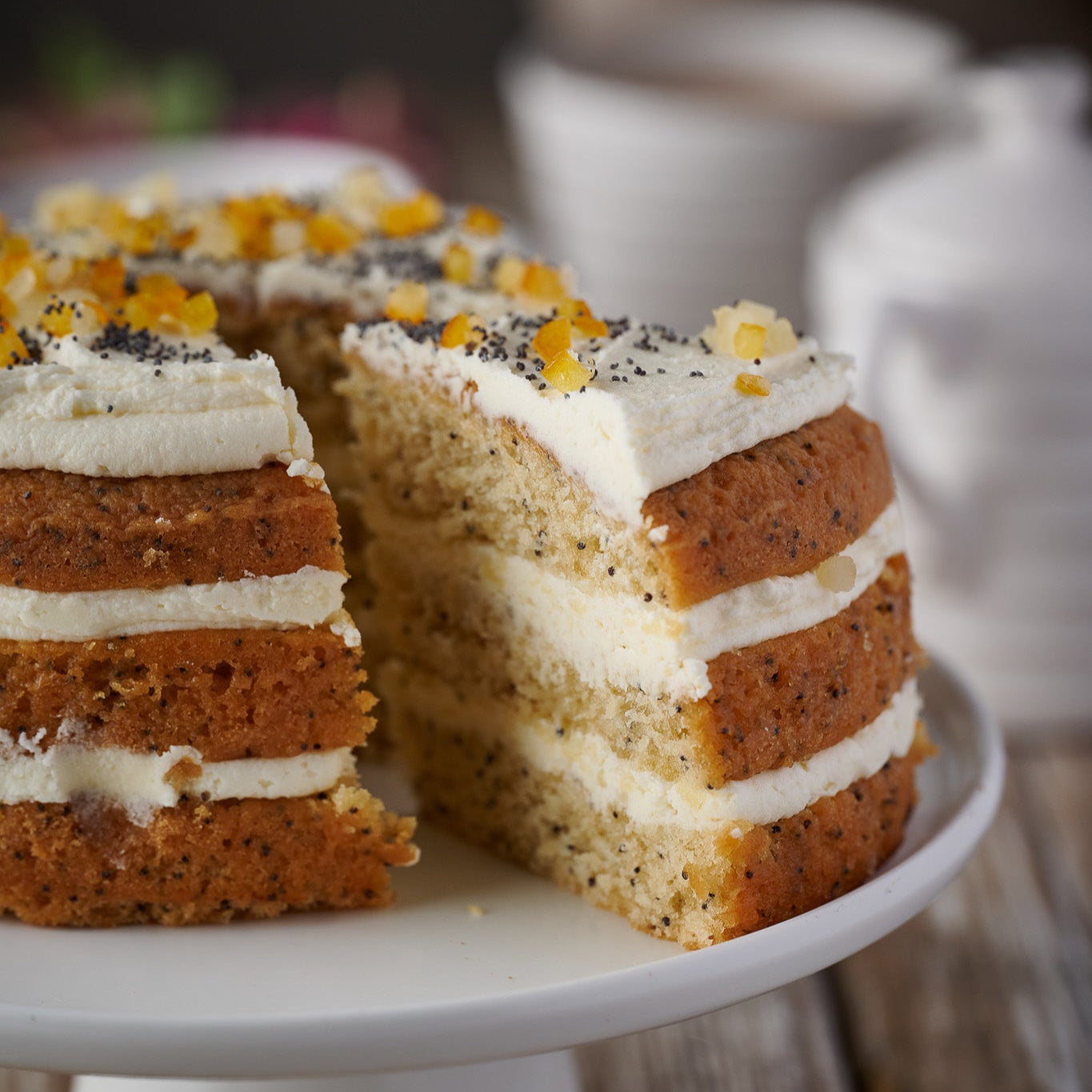 A light and zesty lemon sponge baked with poppy seeds, filled and topped with smooth lemon frosting. Finished with a touch of citrus peel and a sprinkle of poppyseeds.