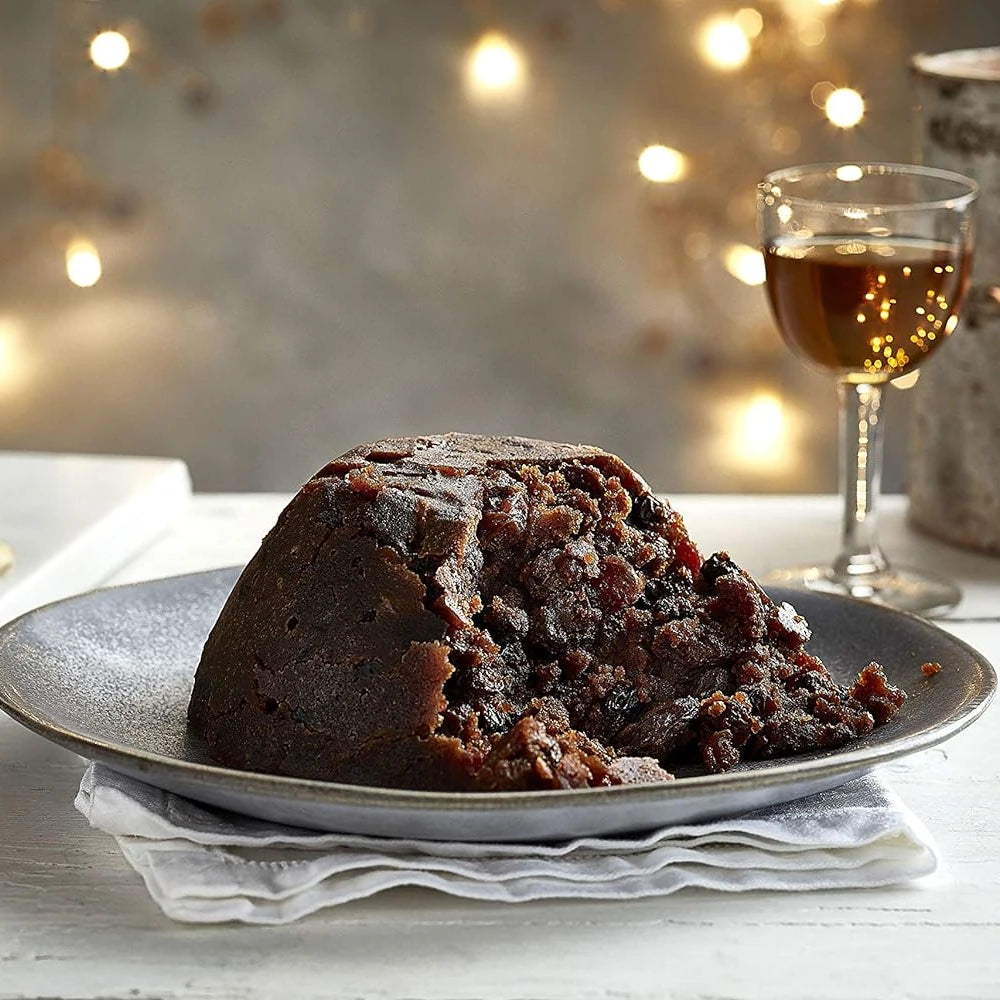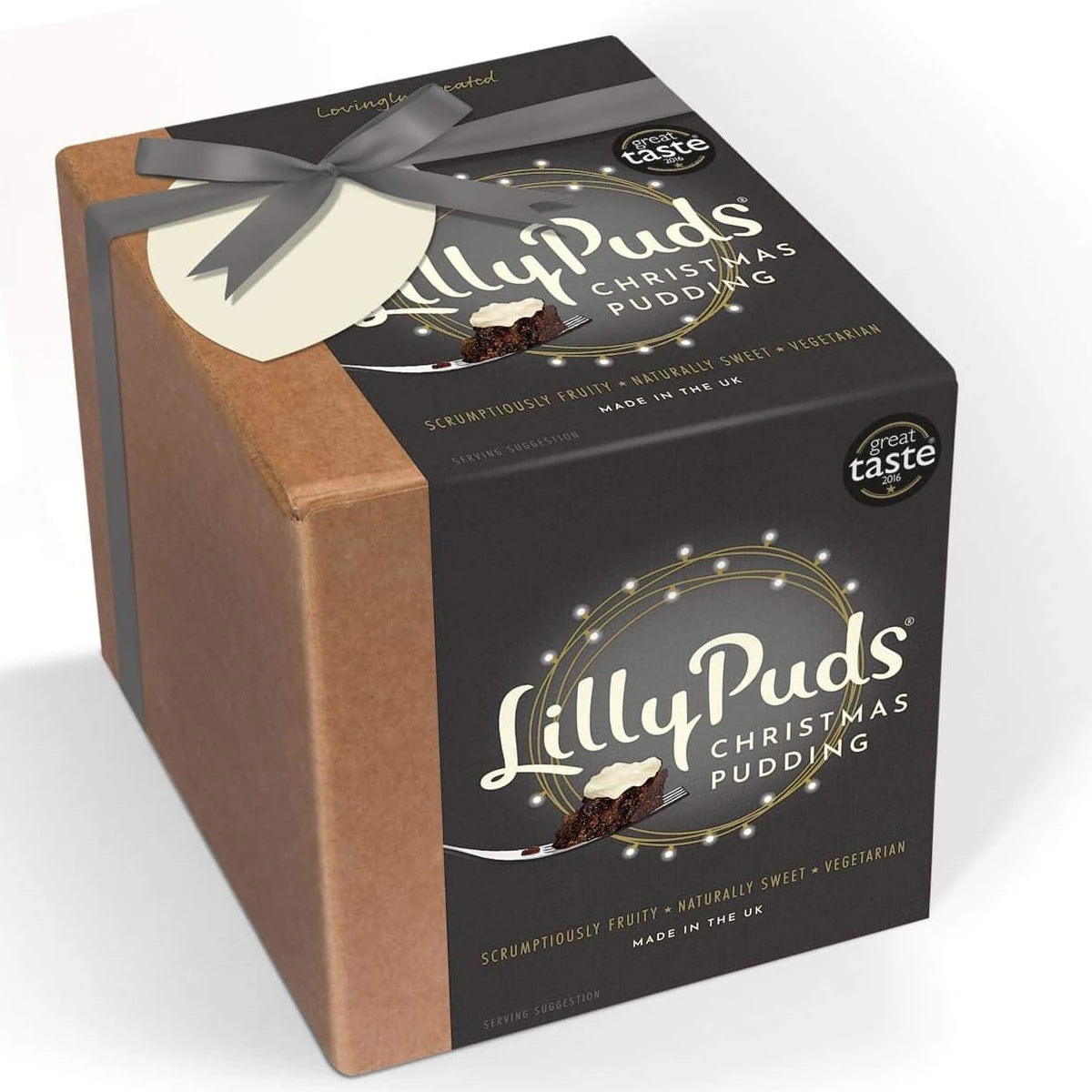 LillyPuds premium traditional Christmas pudding – finest vine fruits, apples, apricots, almonds and ginger blended with ale and brandy.