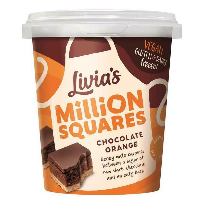Gooey date caramel between a layer of raw dark chocolate and an oaty base. Try these unbelievably tasty, gooey, all-natural Chocolate Orange Million Squares At Livia’s, we say BETTER TREAT YOURSELF! Try these unbelievably tasty, gooey, all-natural Chocolate Orange Million Squares All our products are vegan, gluten and dairy freeee!