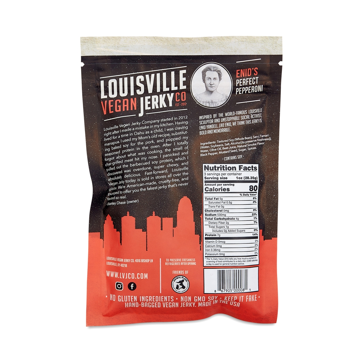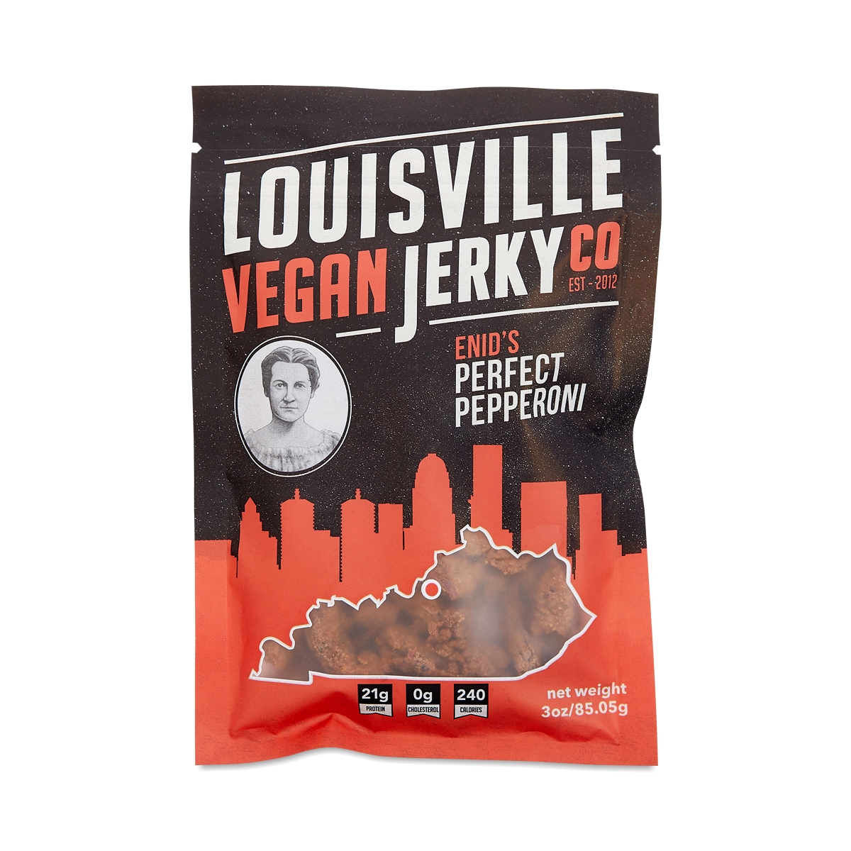 Louisville Vegan Jerky Co provides real Southern comfort with its latest creation, Enid’s Perfect Pepperoni. Named for Louisville sculptor and social activist, Enid Yandell, these tasty strips are a source of hometown pride for more reason than one. They’re totally meat-free, with soy, beet juice, natural smoke flavor, and other zesty spices. Ingredients Textured soy (whole bean), san-j tamari (w...